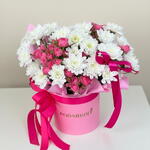 Очаровательная композиция в розовой шляпной коробке выглядит нежно, свежо и по-настоящему празднично. Белоснежные хризантемы в сочетании с миниатюрными розовыми кустовыми розами создают гармоничный и очень уютный образ. Этот букет ассоциируется с заботой, теплом и искренними чувствами. Он прекрасно подойдёт для дня рождения, 8 Марта, благодарности или комплимента без повода. Композиция выглядит аккуратно и стильно, не требуя вазы. Цветы долго сохраняют свежесть и радуют своим аккуратным внешним видом. Рекомендации по уходу: поддерживайте флористическую губку во влажном состоянии, подливая немного воды каждые 1–2 дня; размещайте композицию вдали от прямых солнечных лучей, батарей и сквозняков.