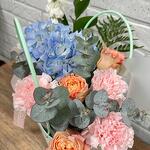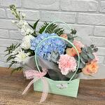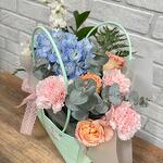 Лента - 1 шт. Маттиола - 1 шт. Рускус - 1 шт. Хризантема кустовая - 1 шт. Эвкалипт - 2 шт. Диантус - 3 шт. Ледерварен - 2 шт. Гортензия голубая - 1 шт. Оазис флористический - 1 шт. Сумочка картонная - 1 шт. розы пионовидные - 3 шт.