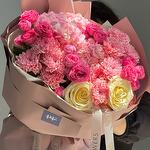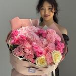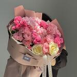 Гортензия - 2 шт. Хризантема кустовая - 3 шт. сборные цветы - 13 шт. аква бумага - 4 шт. розы канделайт пионовидные - 3 шт. спрей роза жизель - 4 шт.