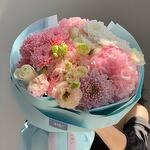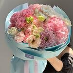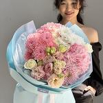 Хризантема кустовая - 3 шт. Хризантема одноголовая - 1 шт. эустома розовая махровая - 3 шт. сборный букет цветов - 15 шт. гортензия королевская - 2 шт. розы эквадор - 7 шт. аква бумага - 5 шт.