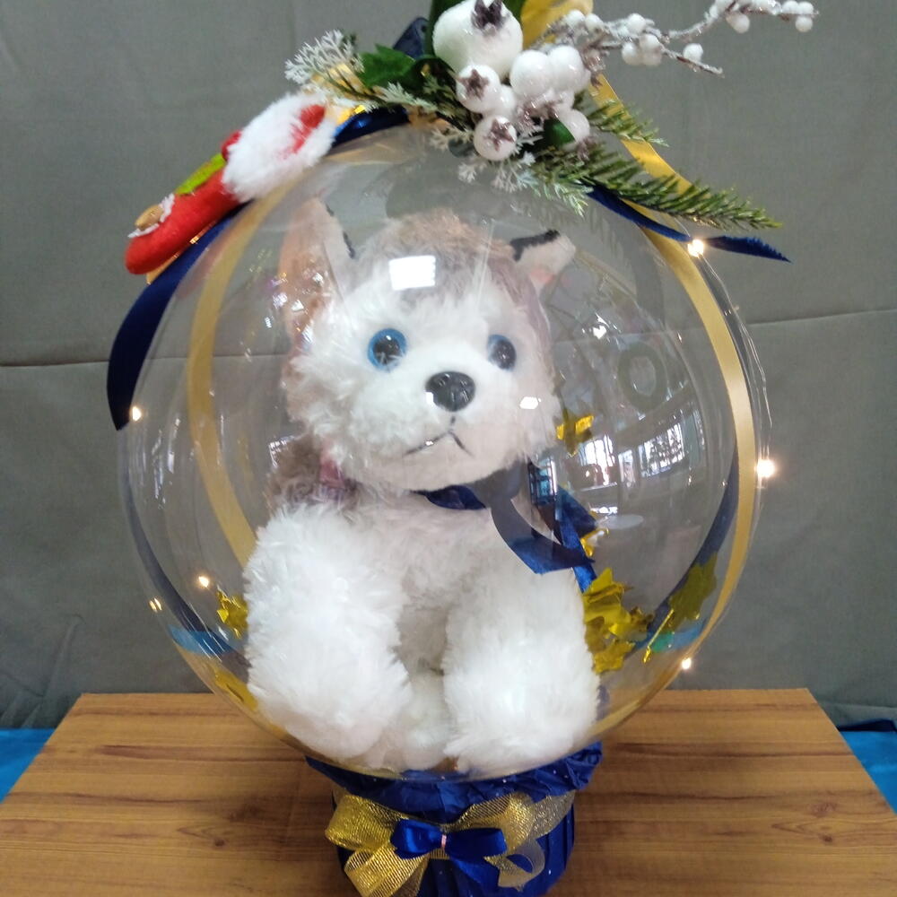 Мягкая игрушка хаски Полимерный шар баблс Коробка круглая Лента атласная Светодиодная гирлянда