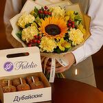 Яркий букет с золотистым подсолнухом, кремовыми гвоздиками, альстромериями и красными ягодами — символ тепла, энергии и уюта. В комплекте авторские макаронс «Dubai collection» с восточным характером: нежная миндальная текстура, фисташка, финики и карамель.