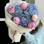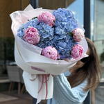 Дуо букет с ароматными пионами и голубыми гортензиями
