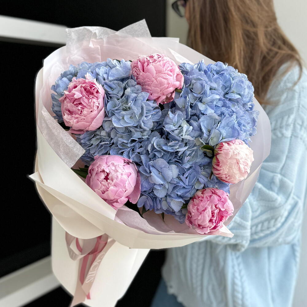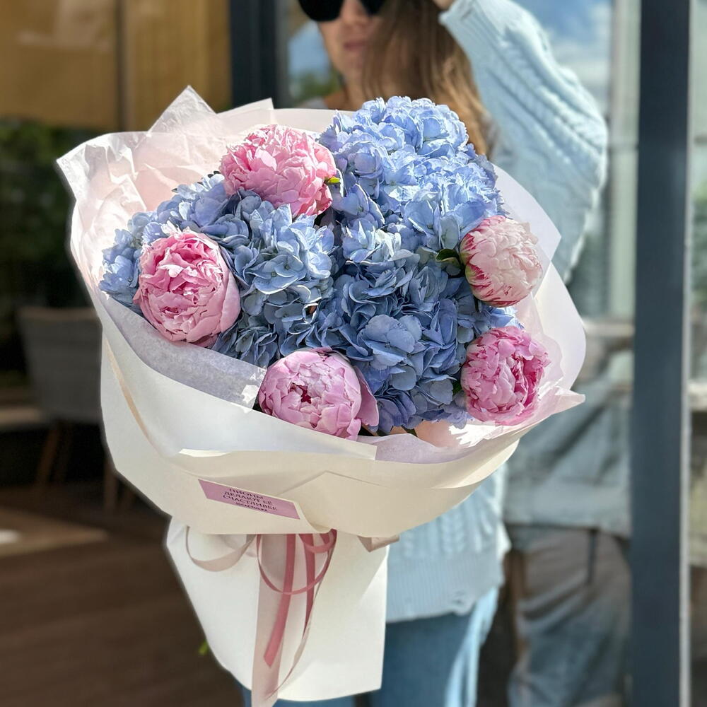 Дуо букет с ароматными пионами и голубыми гортензиями