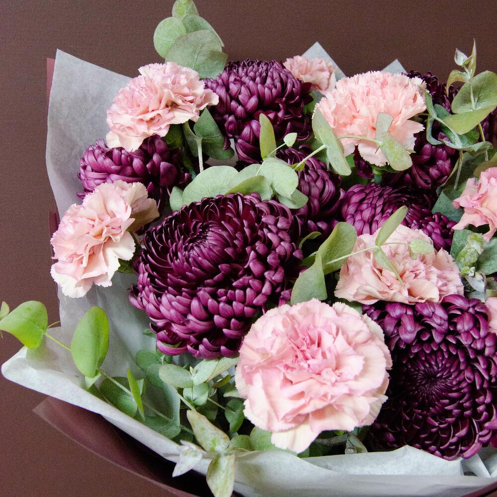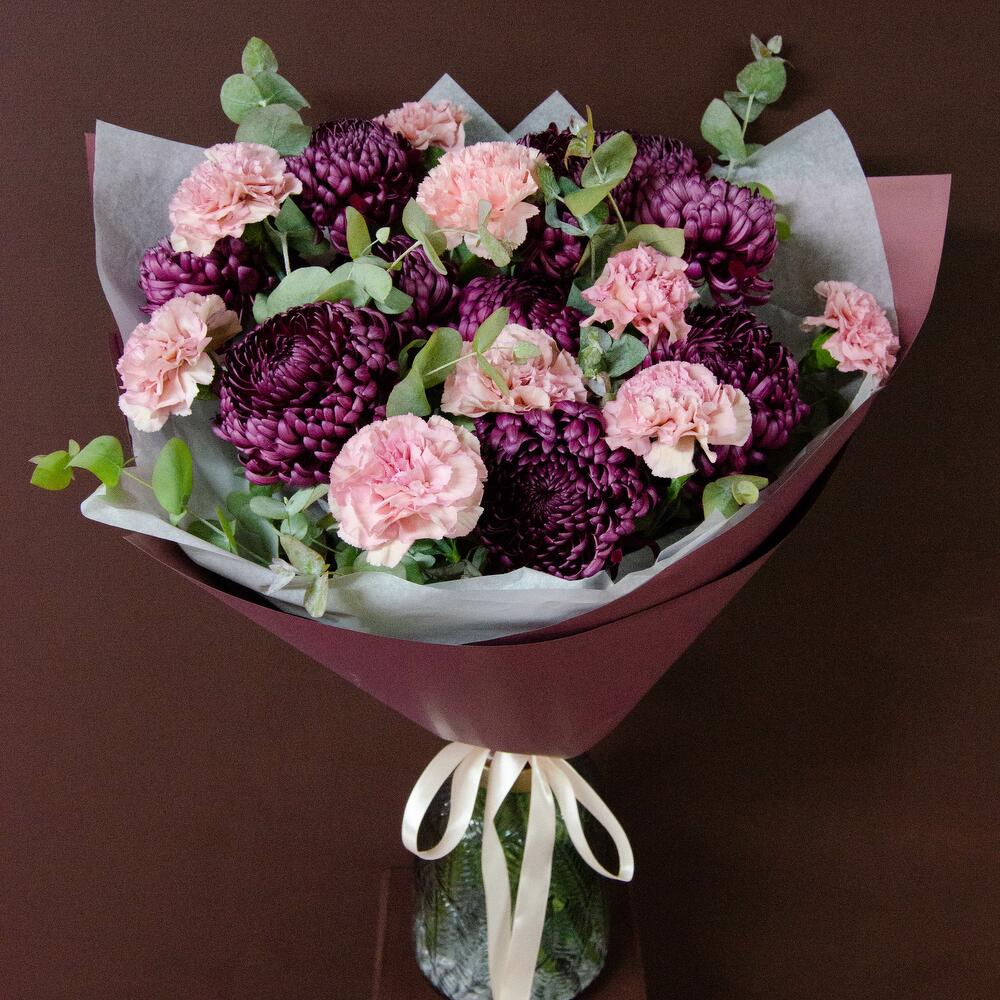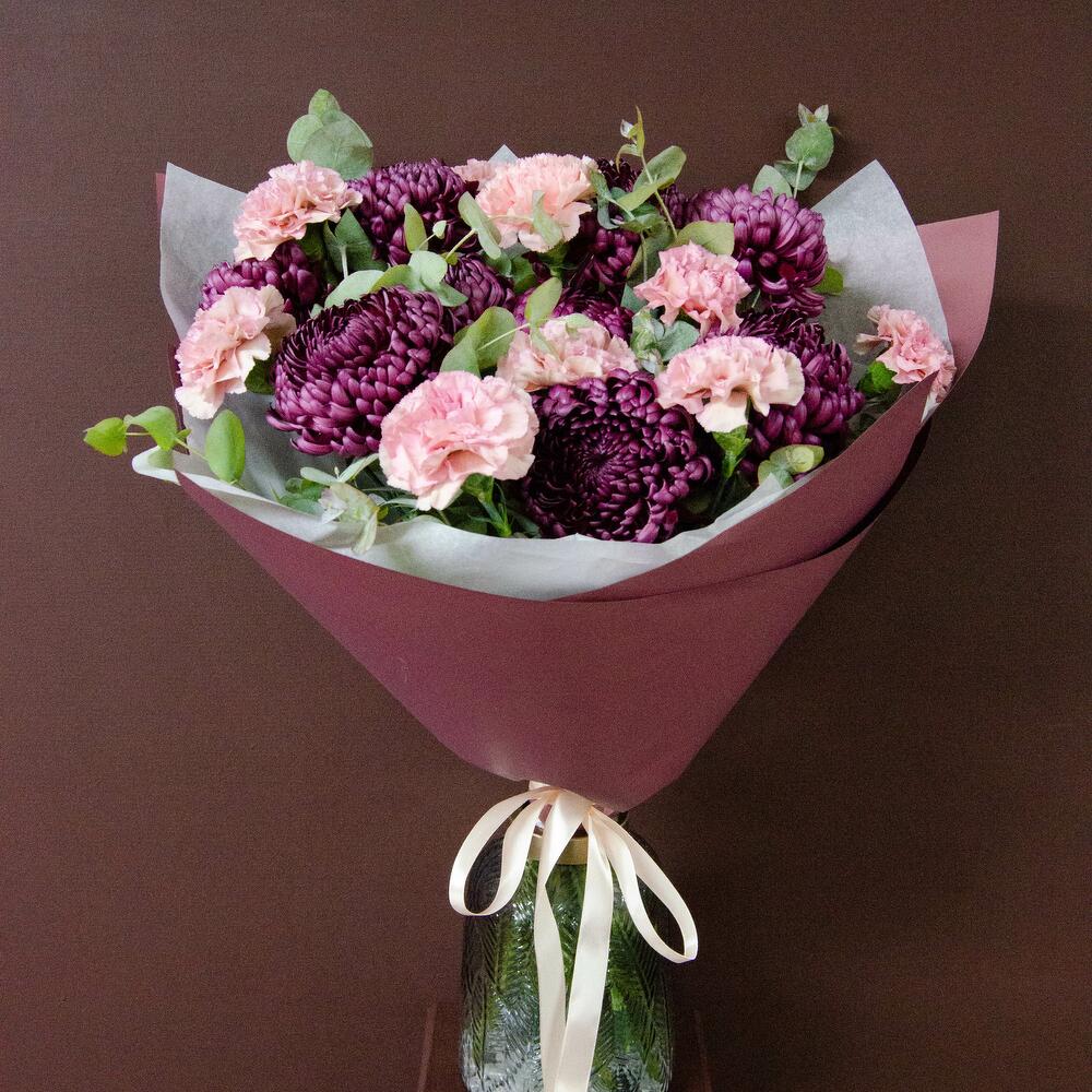 Эвкалипт - 2 шт. Гвоздика - 9 шт. Оформление - 1 шт. хризантема бигуди - 10 шт.