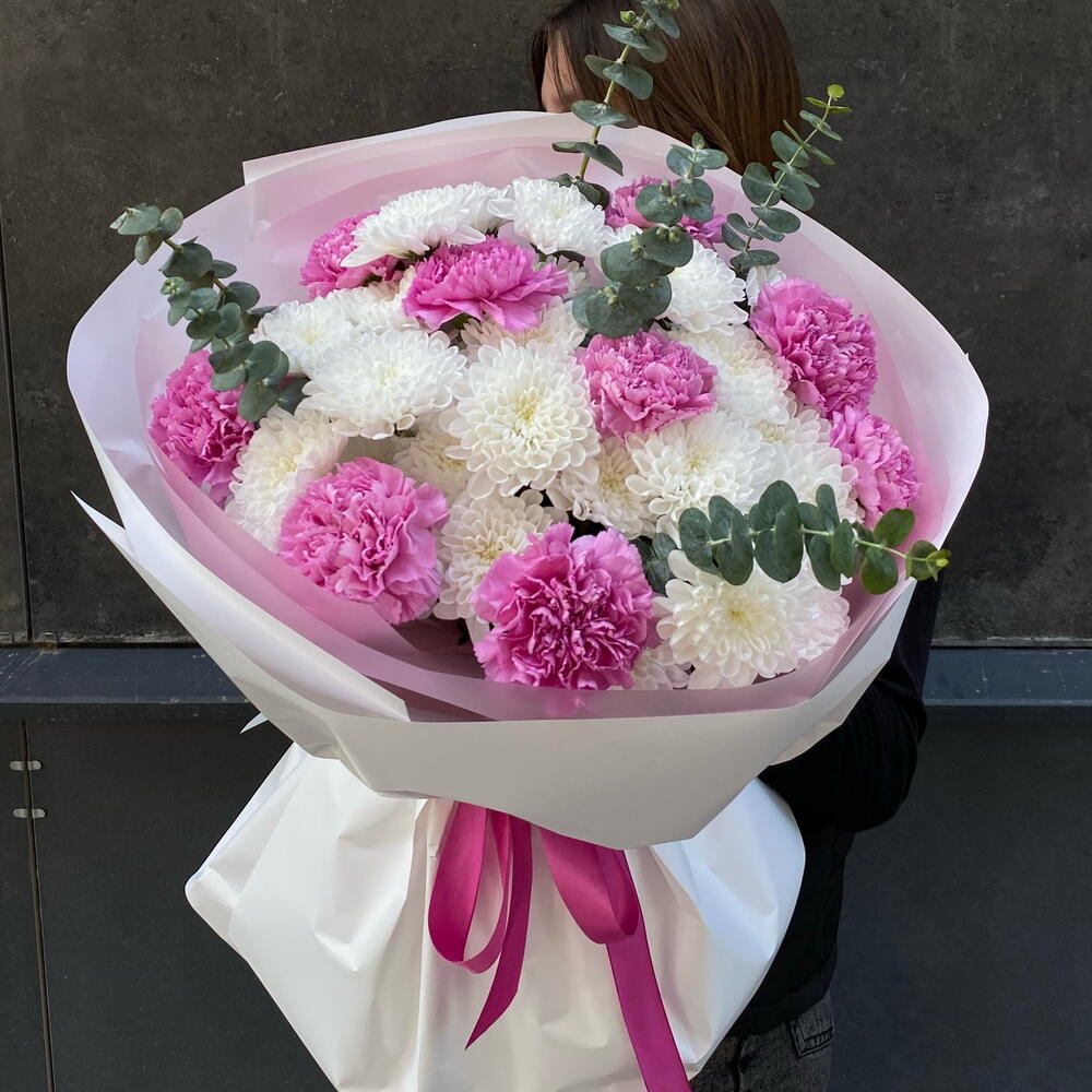 Хризантема кустовая - 5 шт. Эвкалипт - 1 шт. Диантус - 9 шт.
