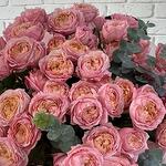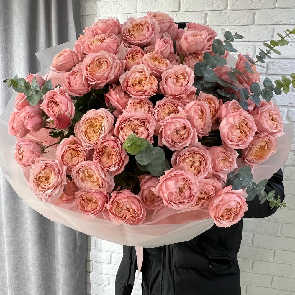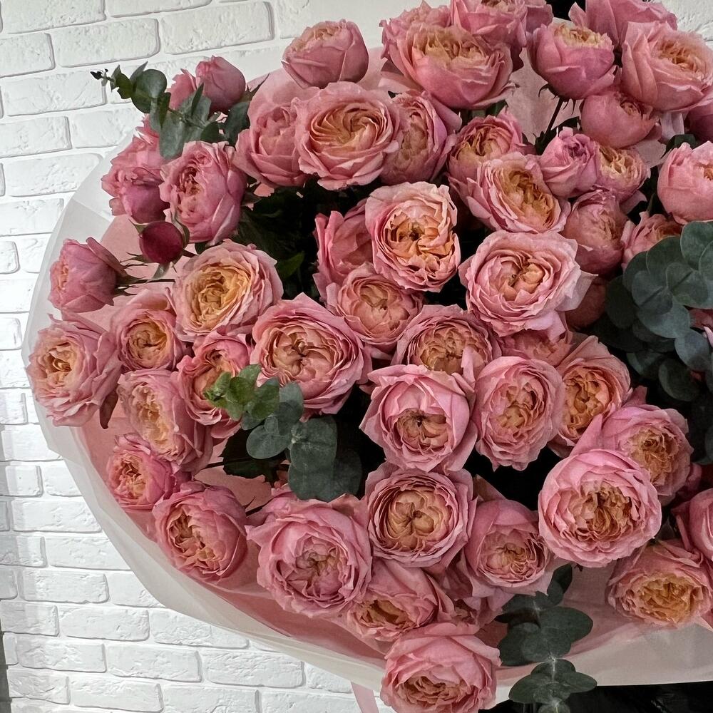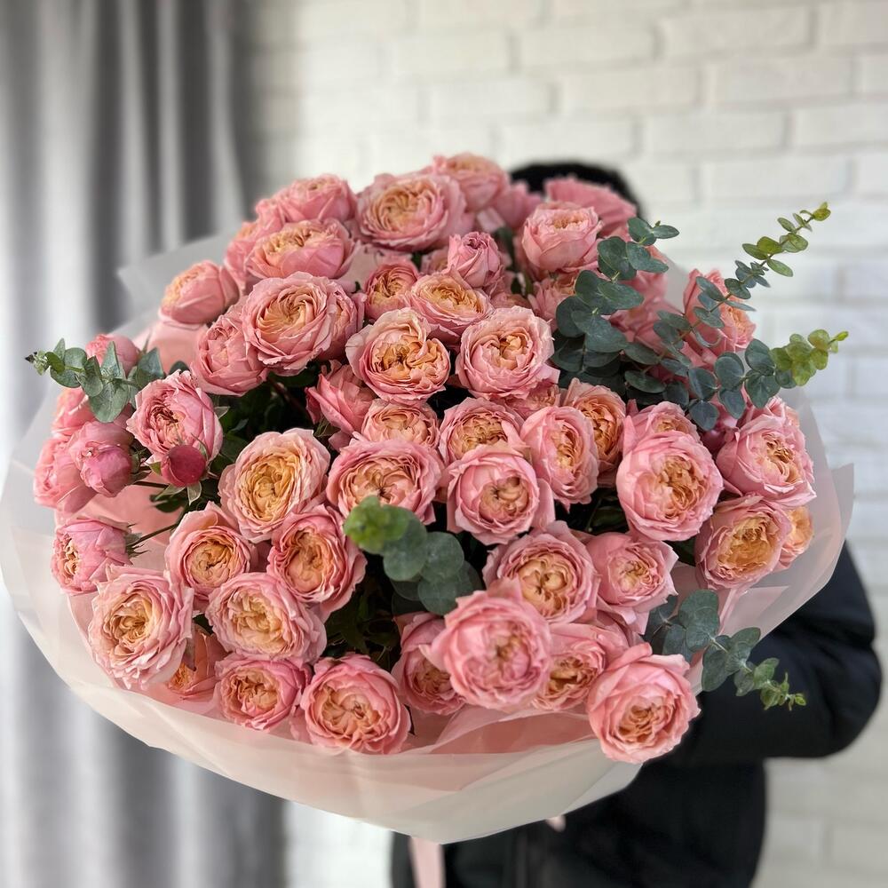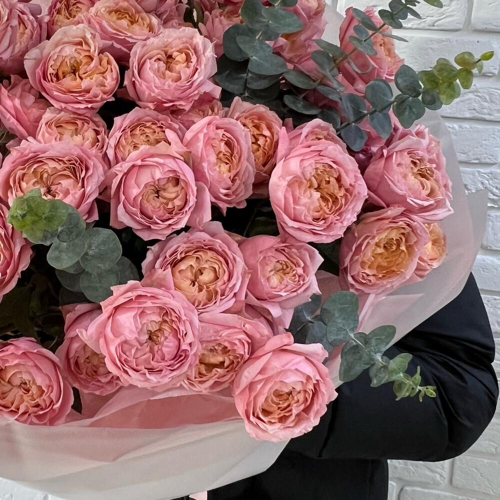Эвкалипт - 6 шт. Тишью розовая - 4 шт. бумага матовая - 5 шт. пионовидные розы джульетта - 19 шт.