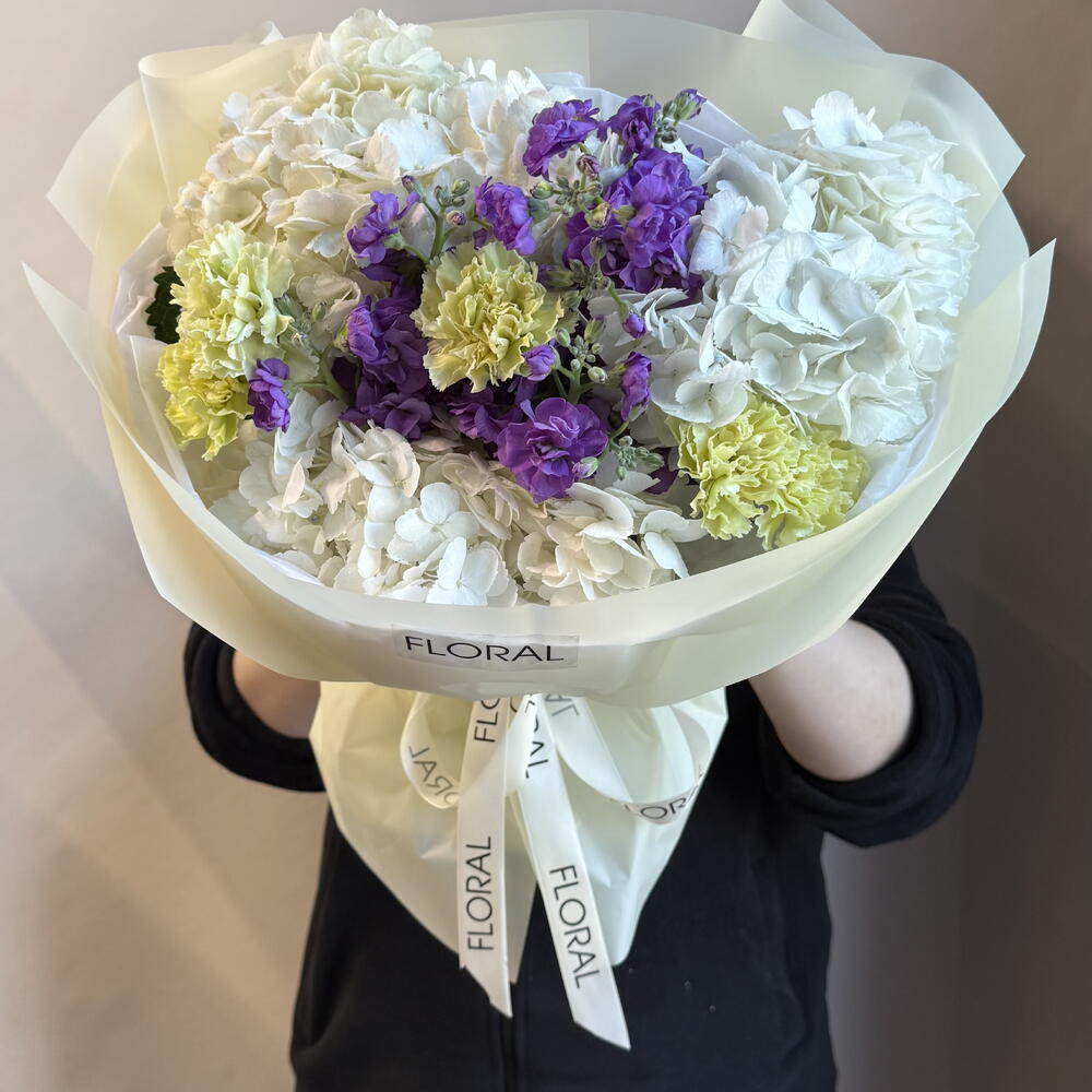 Этот изысканный авторский букет принесет яркую нотку в любое помещение. В его состав входят три элегантних гортензии, тройка пышных диантусов и пара ароматных кустовых маттиол. Каждое растение в букете тщательно подобрано и гармонично сочетается между собой, создавая неповторимую композицию. Этот букет станет изысканным подарком для самых тонконаблюдательных ценителей флористики.