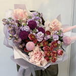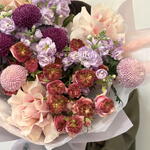 Дельфиниум - 2 шт. Роза кустовая - 3 шт. Роза Эквадор - 3 шт. Хризантема одноголовая - 5 шт. Упаковка дизайнерская - 1 шт. маттиола кустовая - 5 шт.