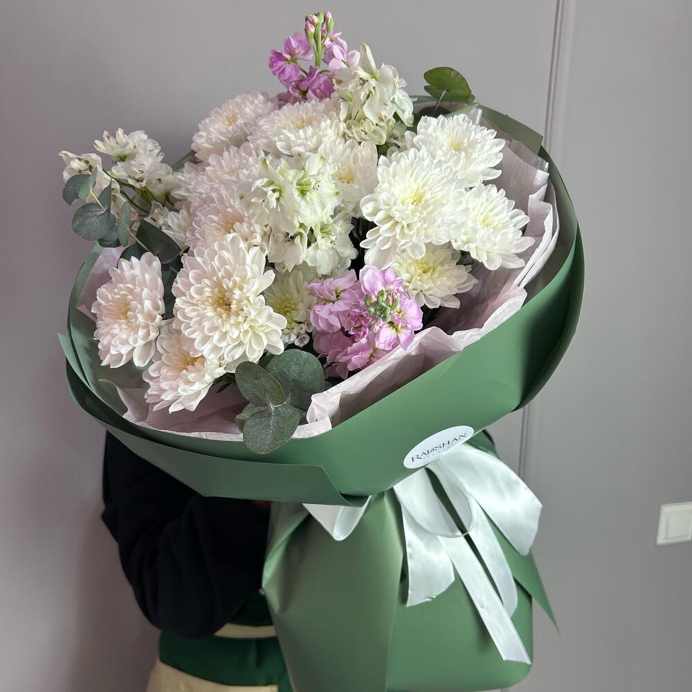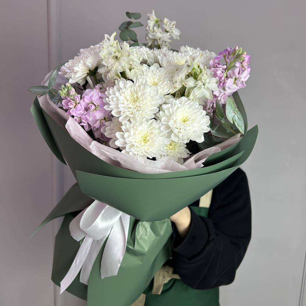 Маттиола - 5 шт. Хризантема кустовая - 3 шт. Эвкалипт - 3 шт.