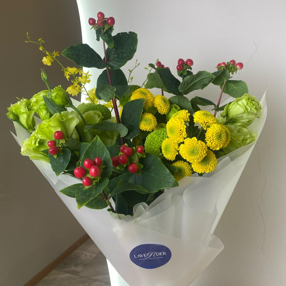 Гиперикум - 3 шт. Эустома - 5 шт. момоко хризантема - 3 шт. онцидиум - 1 шт. алтай хризантема - 2 шт.