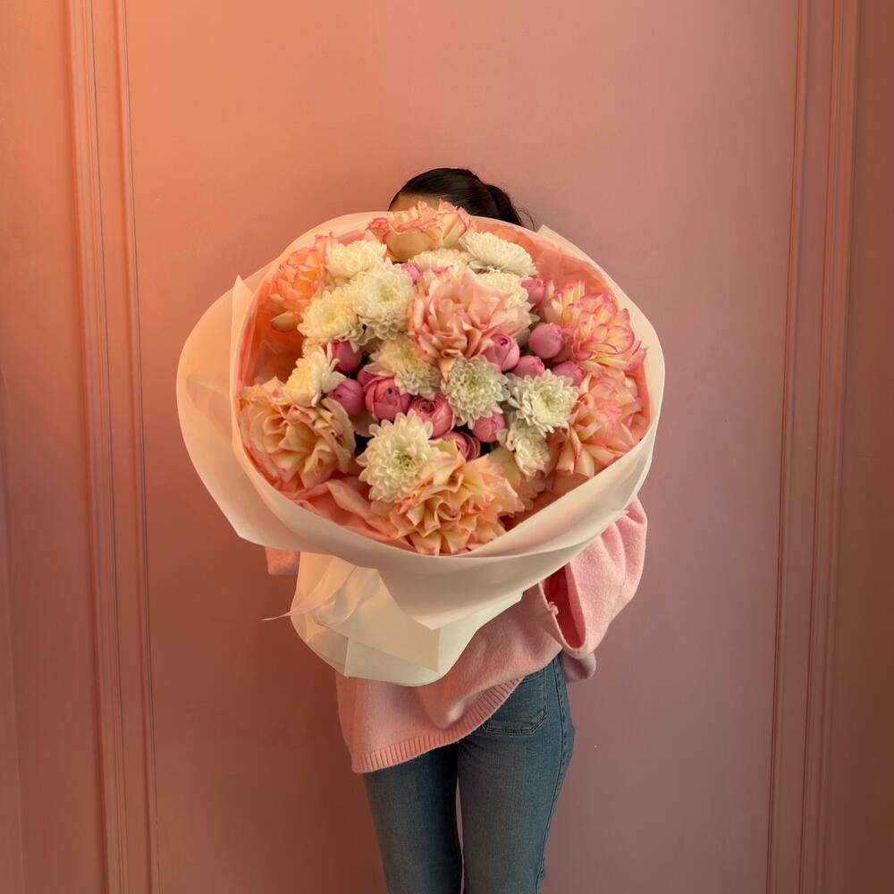 Кустовая хризантема - 3 шт. Пионовидная кустовая роза - 4 шт. Одноголовая роза - 7 шт.