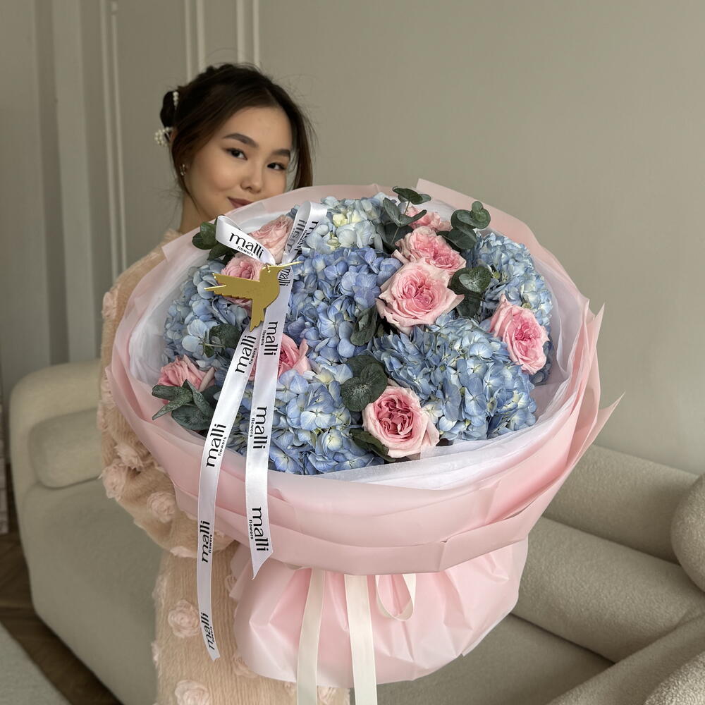 Гортензия - 6 шт. Пионовидная роза - 9 шт. Эвкалипт Цинерея - 5 шт.