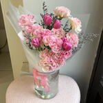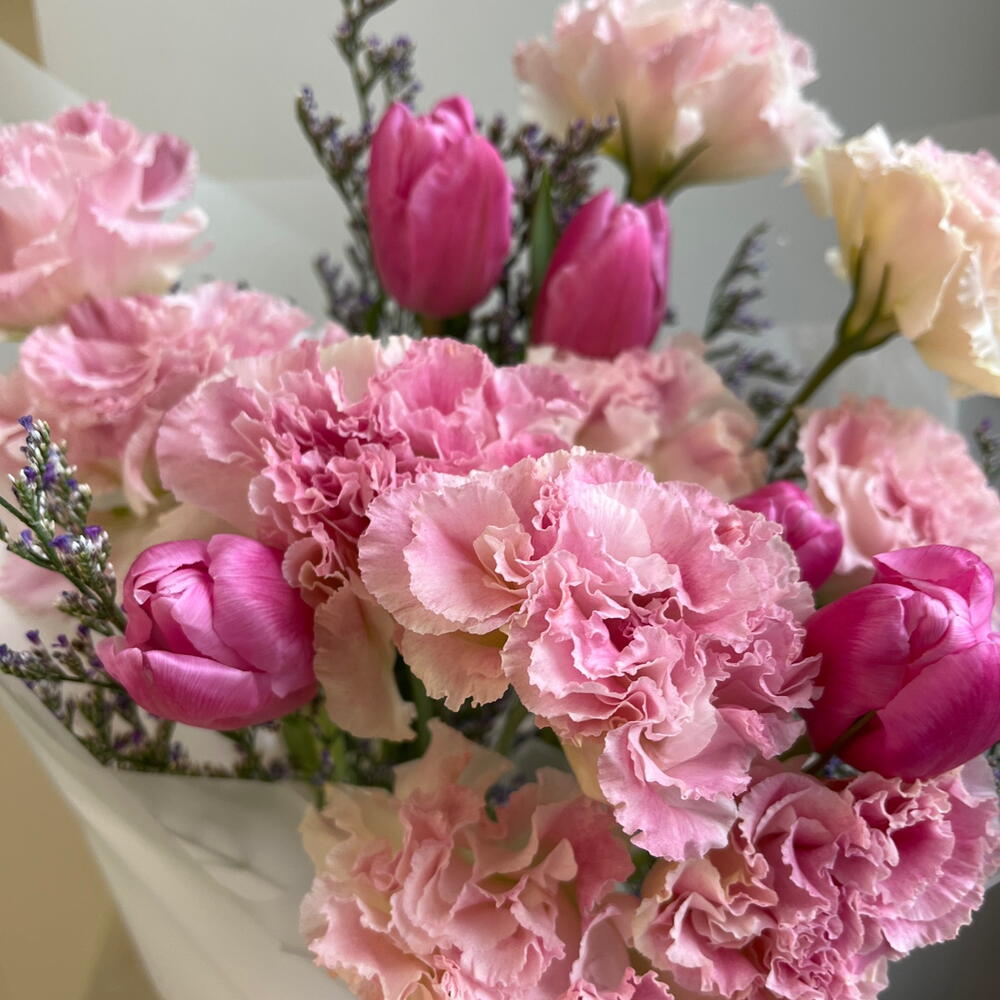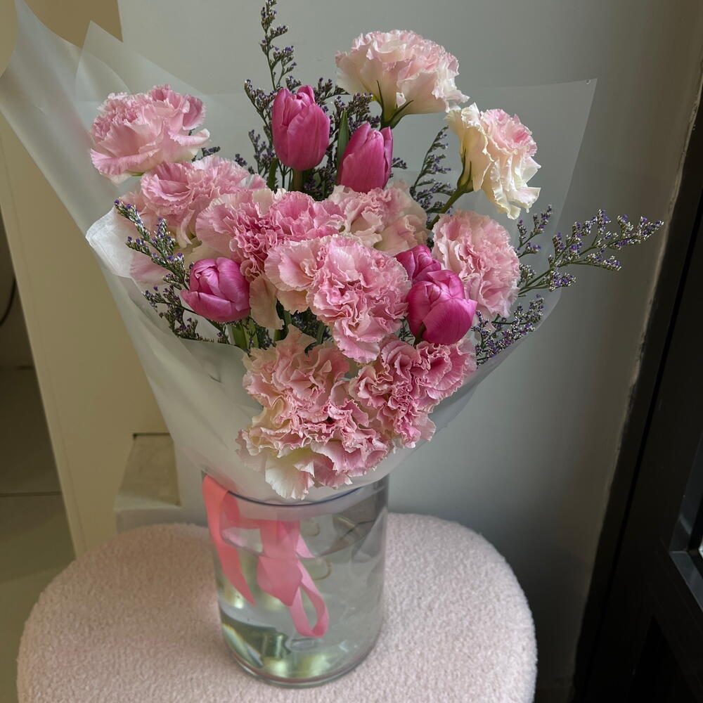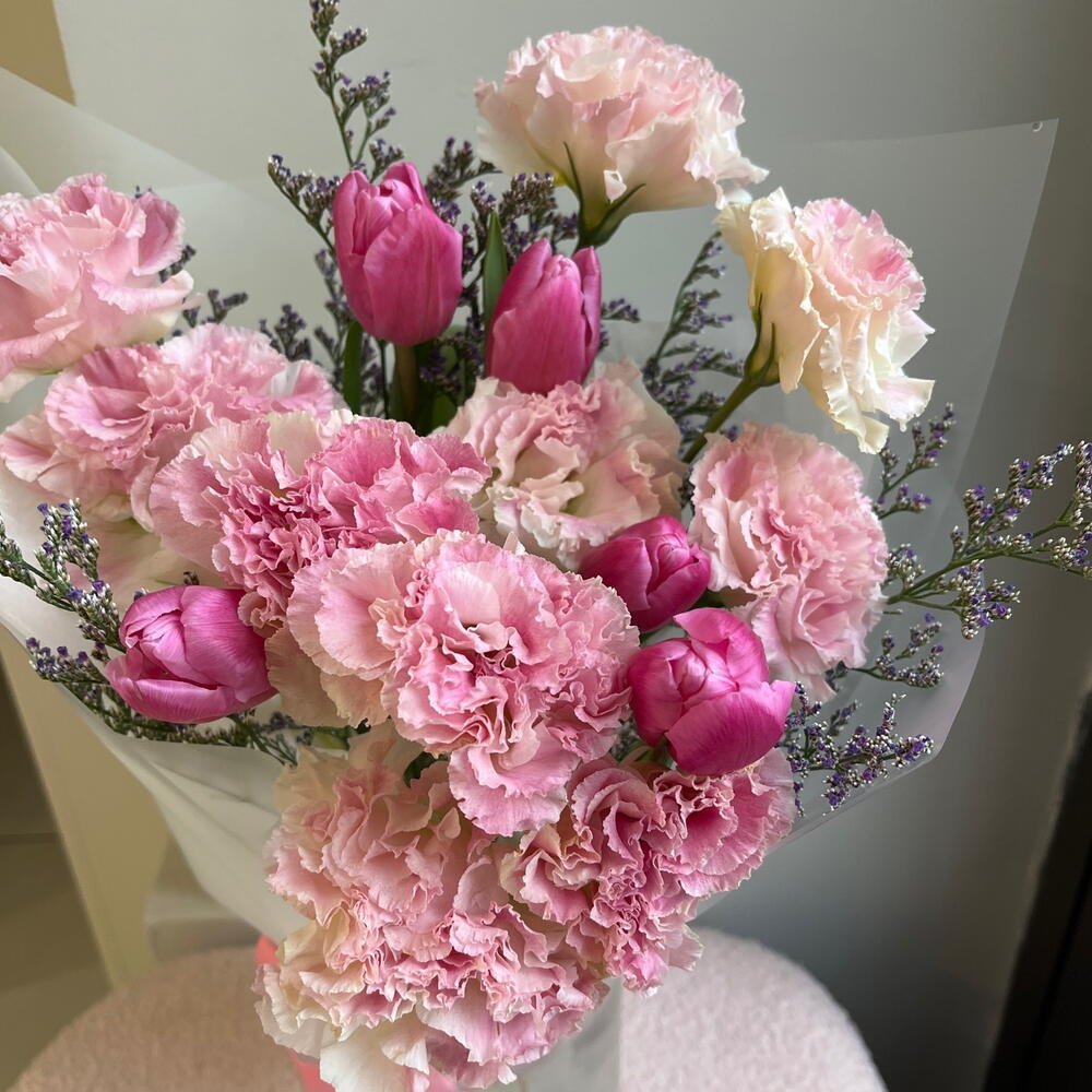 Лимониум - 2 шт. Тюльпан - 5 шт. эустома розовая - 4 шт. переноска для цветов - 1 шт.