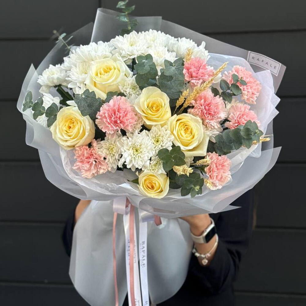 Нежный, светлый и очень тёплый букет с ощущением уюта и заботы. Он словно про «дом», спокойствие и искренние чувства — без пафоса, но с характером. Кремовые розы добавляют мягкую элегантность, хризантемы создают объём и свежесть, розовая гвоздика вносит трепет и романтику, а пшеница даёт тот самый живой акцент, который делает композицию особенной. Эвкалипт аккуратно балансирует оттенки и завершает образ.