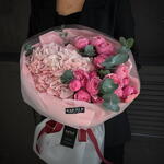 Мягкий, чувственный букет в нежно-розовой палитре — про спокойную любовь, тепло и внимание к деталям. Воздушная гортензия создаёт объём и облачность, пионовидные спрей-розы добавляют романтику и глубину, а эвкалипт аккуратно расставляет зелёные акценты и свежесть. Упаковка подчёркивает премиальность композиции, не перегружая её.