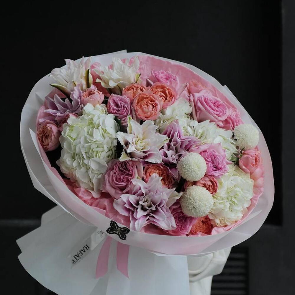 Гортензия - 3 шт. Роза Охара - 7 шт. лилия пионовидная - 2 шт. спрей роза пионовидная - 5 шт. хризантема одиночка - 3 шт.