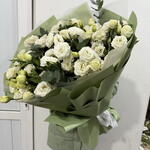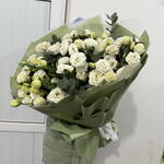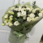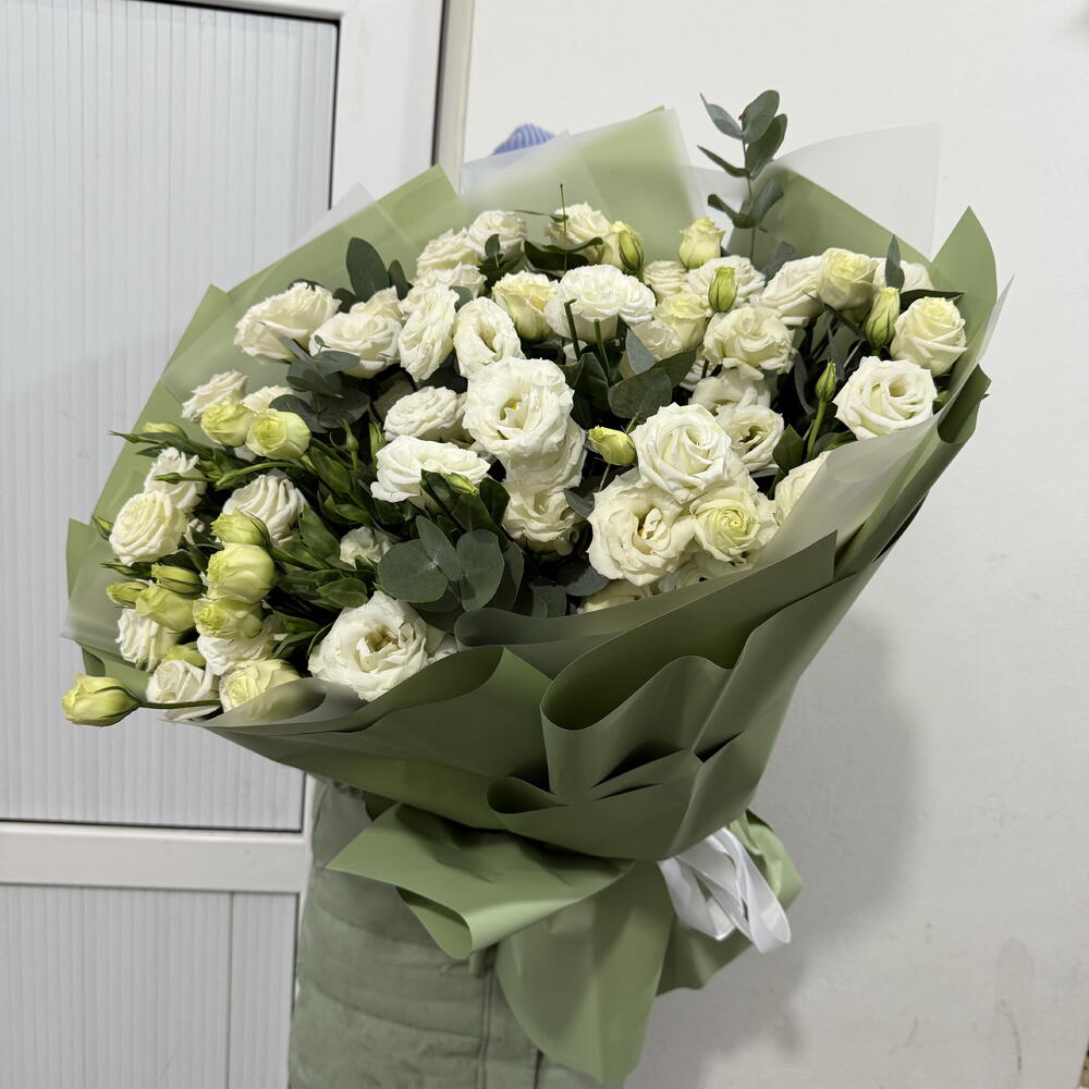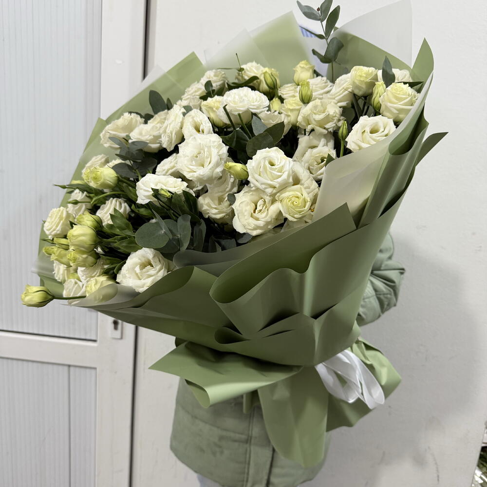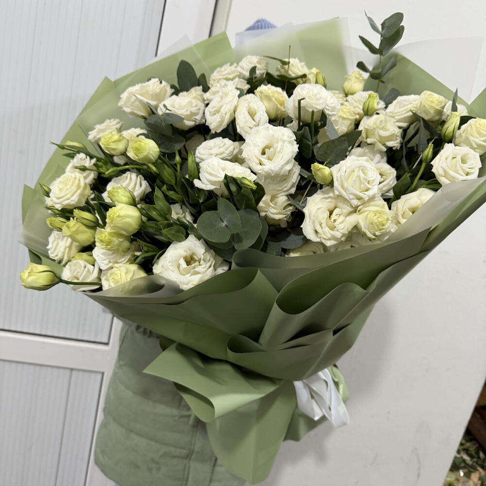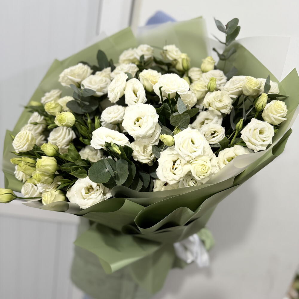 Лизиантус - 19 шт. Эвкалипт - 8 шт. Лента атласная - 1 шт. упаковка аква бумага - 10 шт.