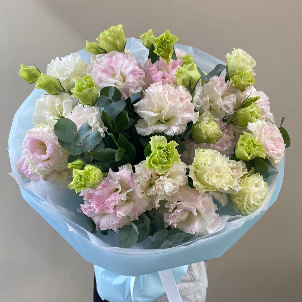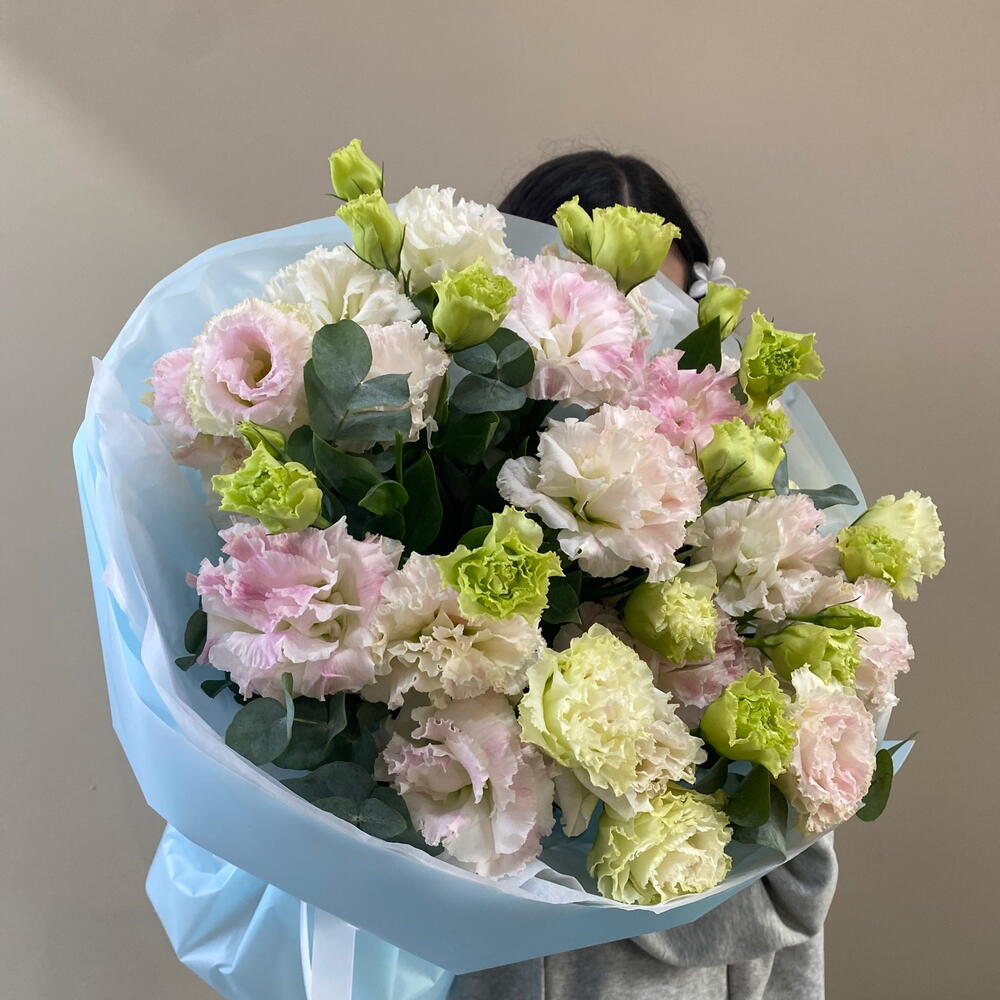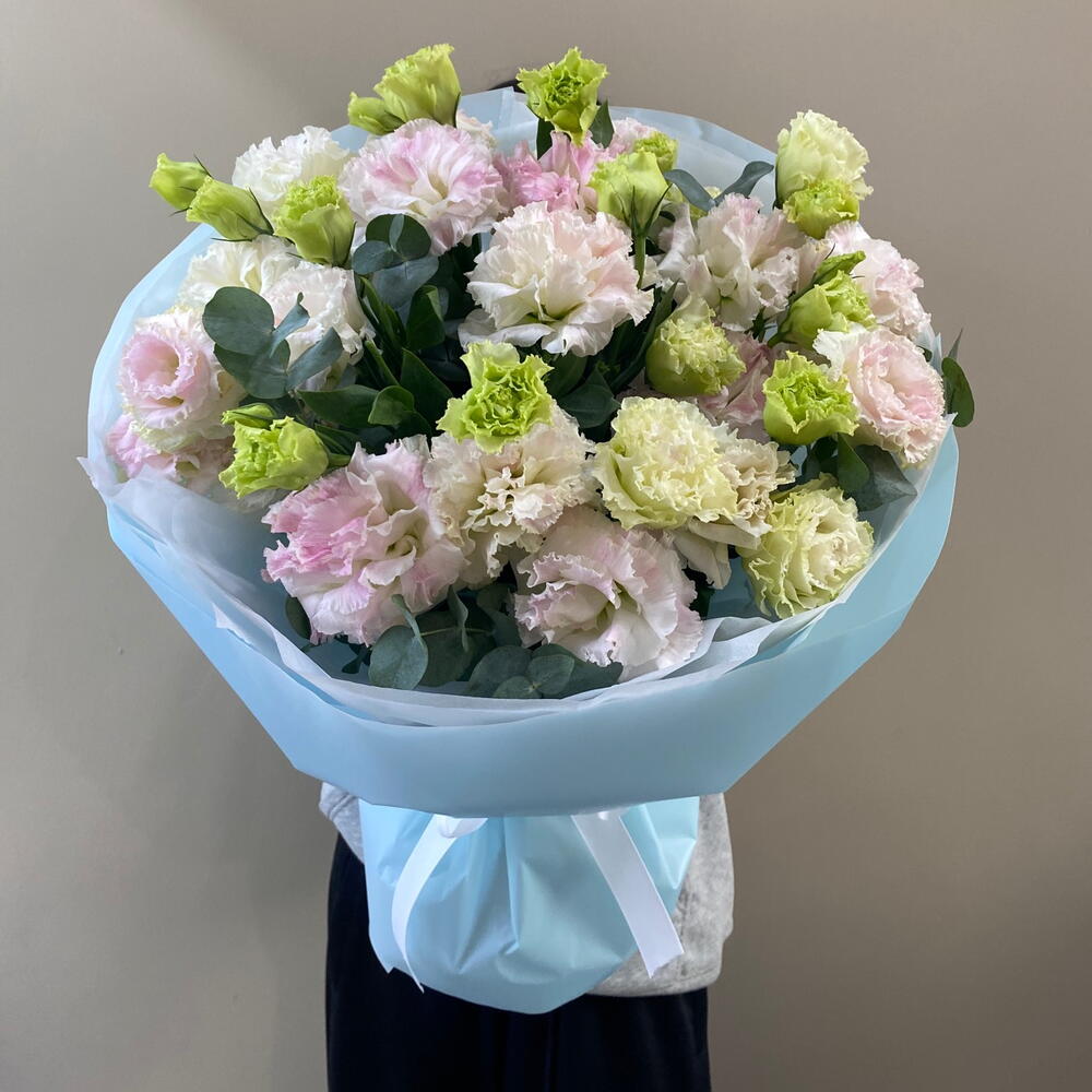 Эвкалипт - 1 шт. Эустома - 11 шт. Оформление матовая пленка - 1 шт.