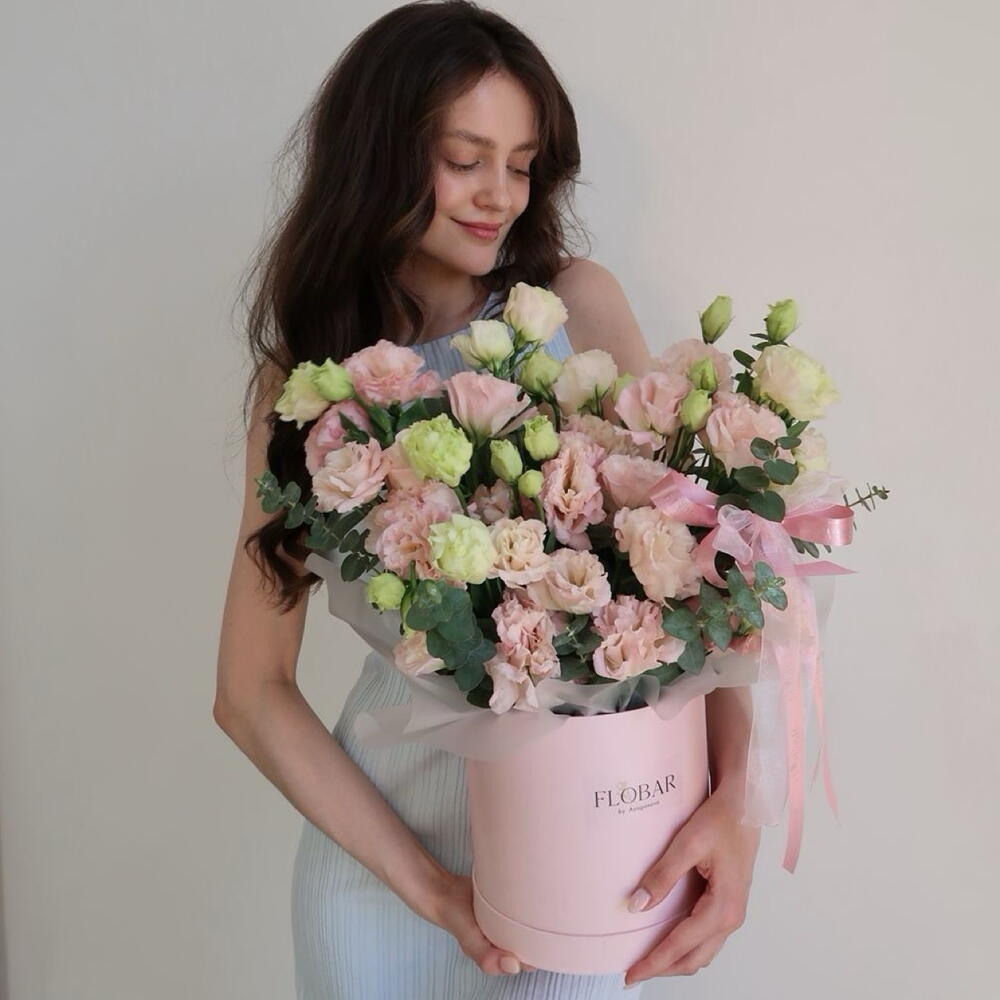 Эвкалипт - 1 шт. Эустома - 7 шт. Коробка шляпная - 1 шт.