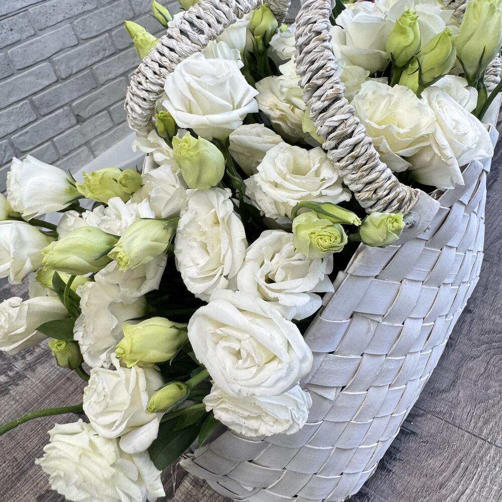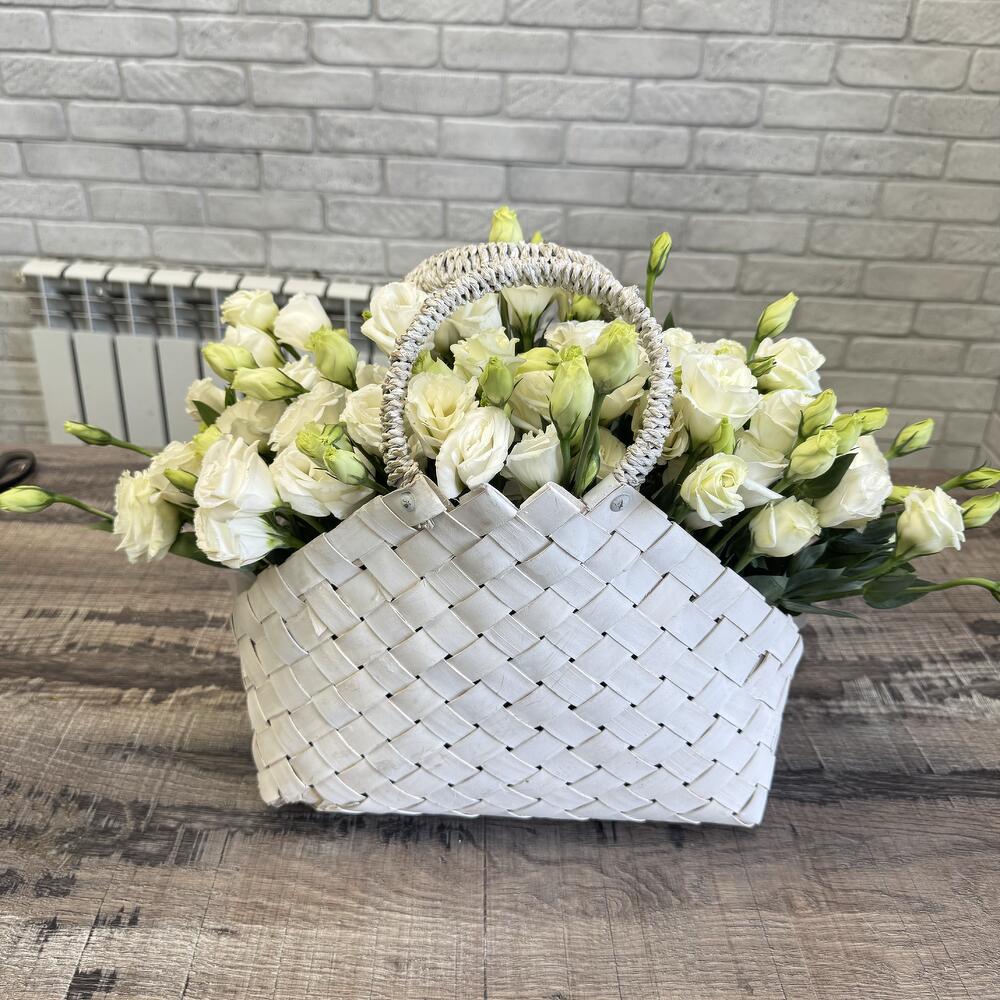 Корзина плетеная - 1 шт. Оазис флористический - 1 шт. эустома белая - 17 шт.
