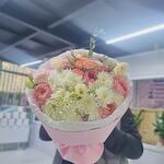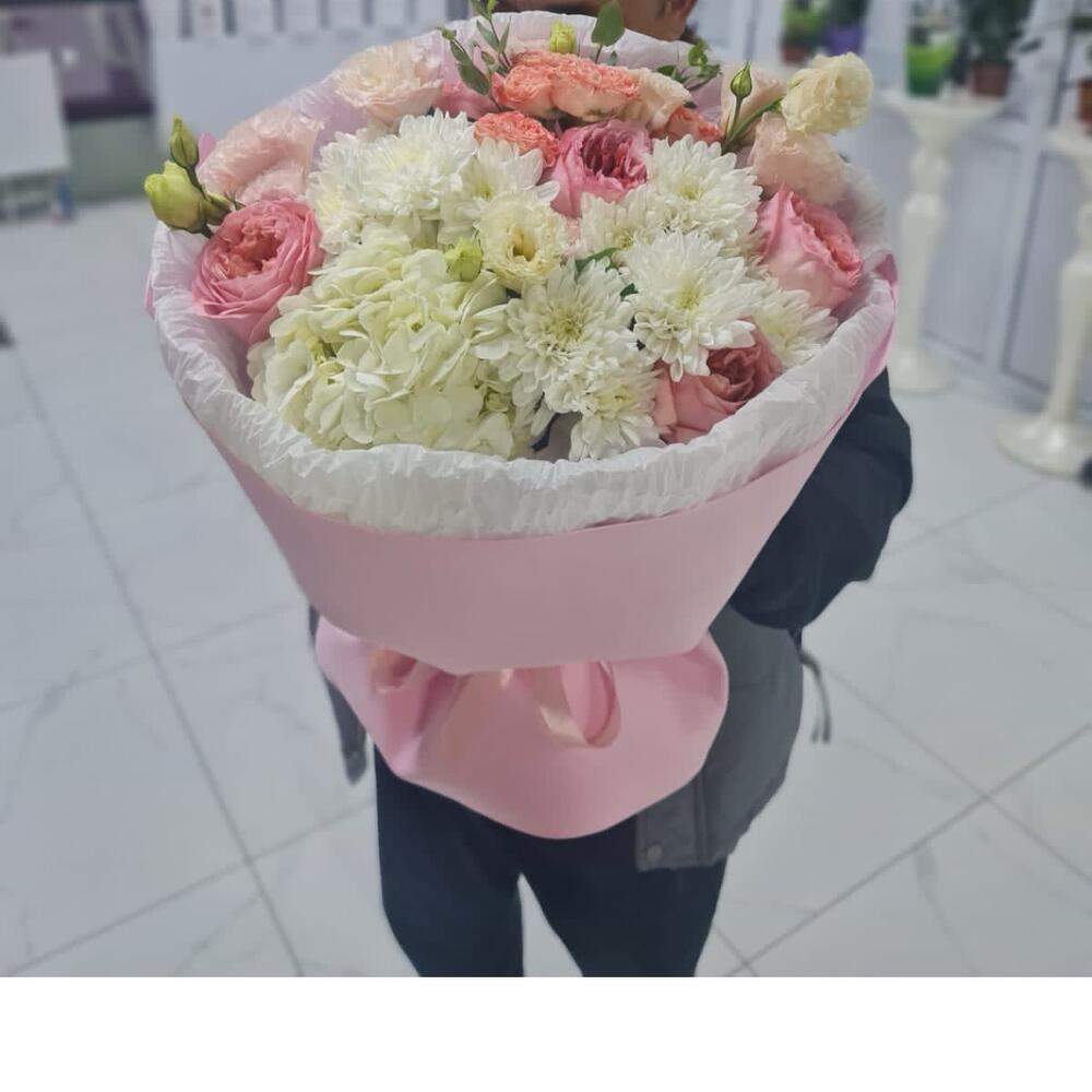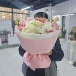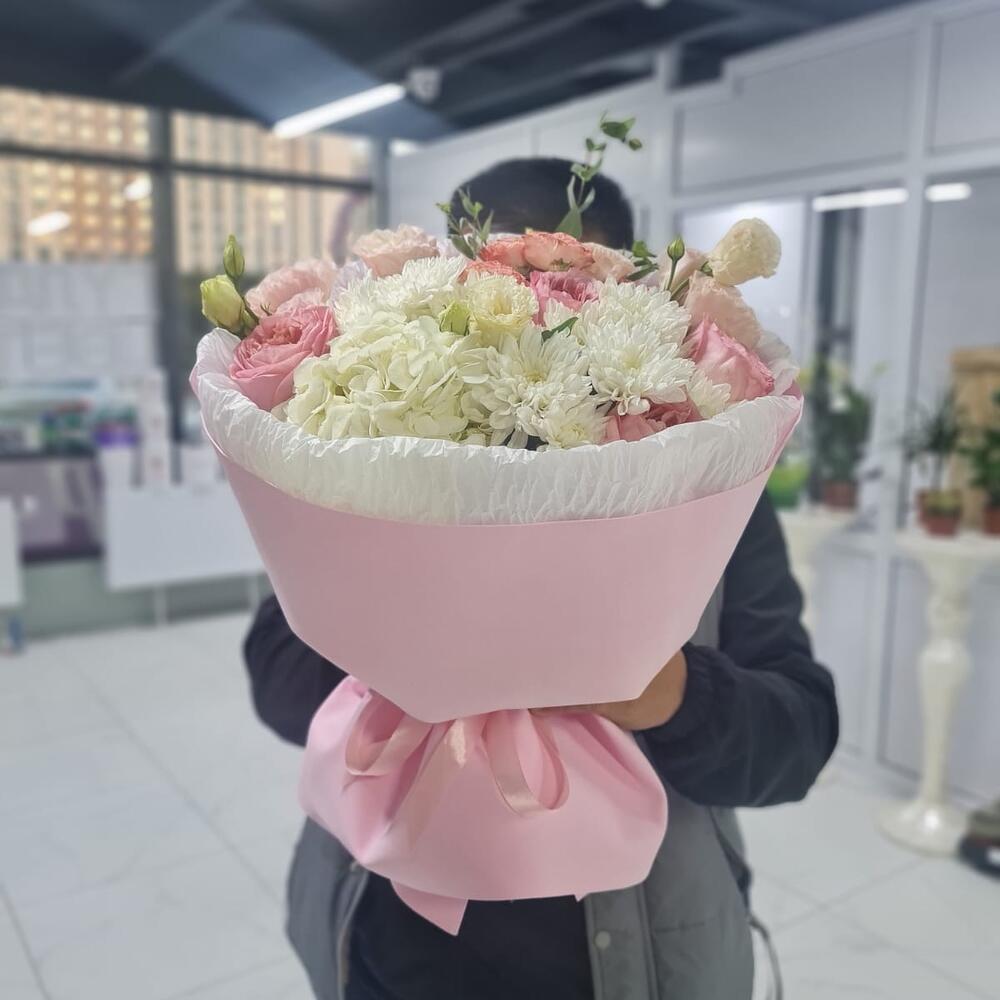 Лизиантус Алиса Белый - 2 шт. гортензия в ассортименте - 1 шт. лизиантум алиса pink - 2 шт. аква бумага - 4 шт. зелень в ассортименте пучок - 1 шт. кустовые розы в ассортименте - 1 шт. розы эквадор (60 см) импорт в ассортименте - 5 шт.