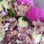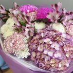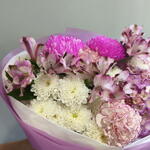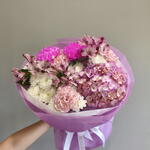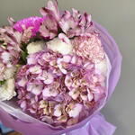 Альстромерия - 3 шт. Хризантема кустовая - 5 шт. Хризантема одноголовая - 2 шт. Гортензия розовая - 1 шт. диантусы сортовые - 3 шт.