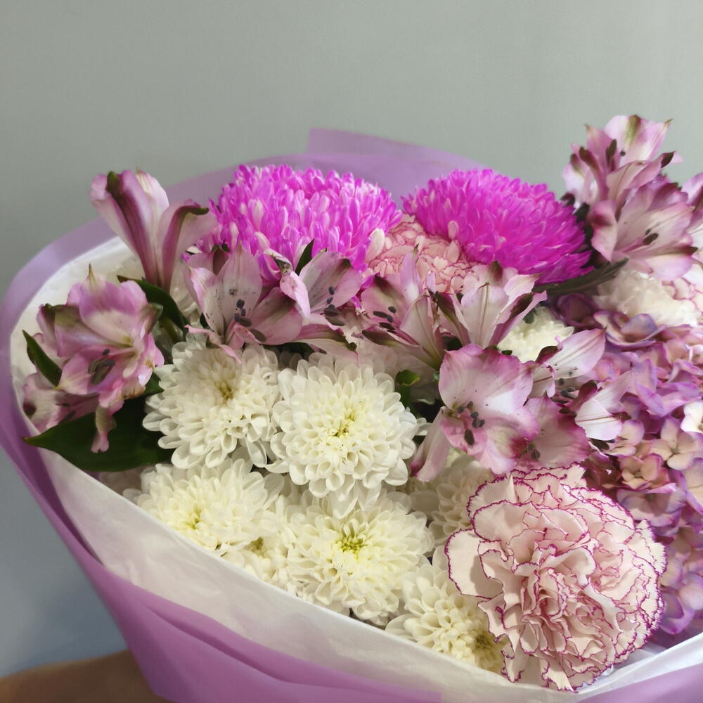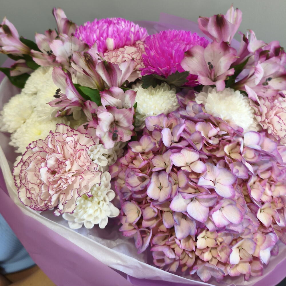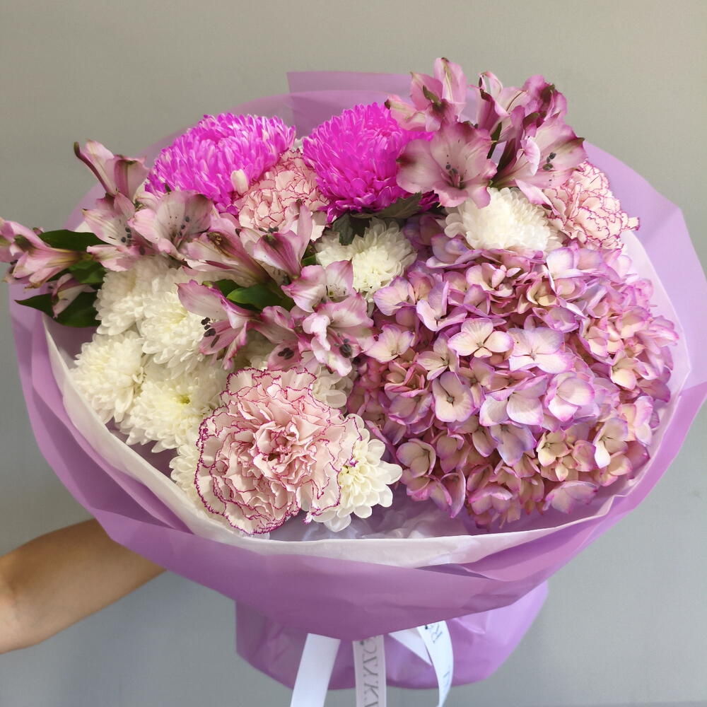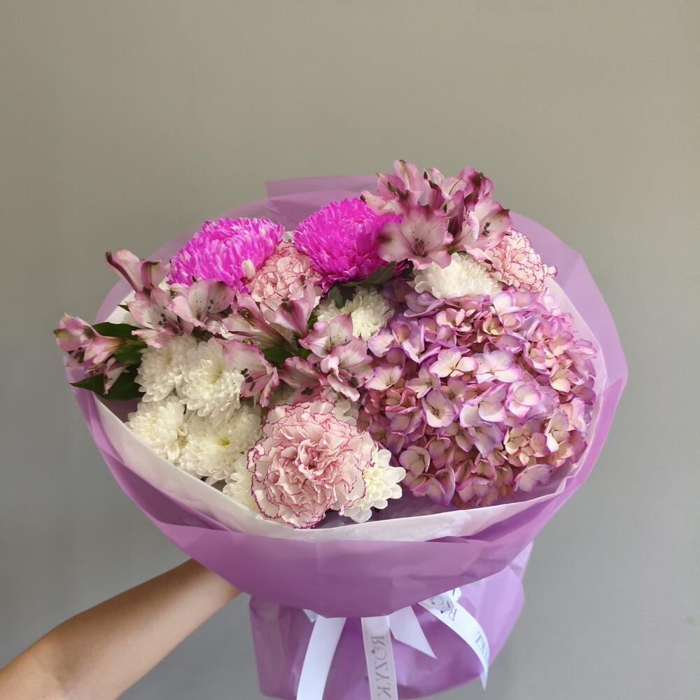 Альстромерия - 3 шт. Хризантема кустовая - 5 шт. Хризантема одноголовая - 2 шт. Гортензия розовая - 1 шт. диантусы сортовые - 3 шт.