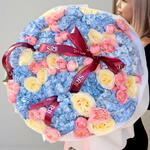 Этот потрясающий букет покоряет своей нежностью и яркостью одновременно. Гармоничное сочетание небесно-голубых гортензий, нежно-розовых и кремовых роз создаёт впечатление легкости и воздушности. Такой букет идеально подойдёт для признания в любви, торжества или особого события, когда важны эмоции и красота. Каждая деталь в нём словно говорит о нежности, заботе и радости жизни. Чтобы цветы дольше радовали свежестью, рекомендуется менять воду каждые 2 дня, подрезать стебли под углом и держать букет вдали от прямых солнечных лучей и сквозняков.