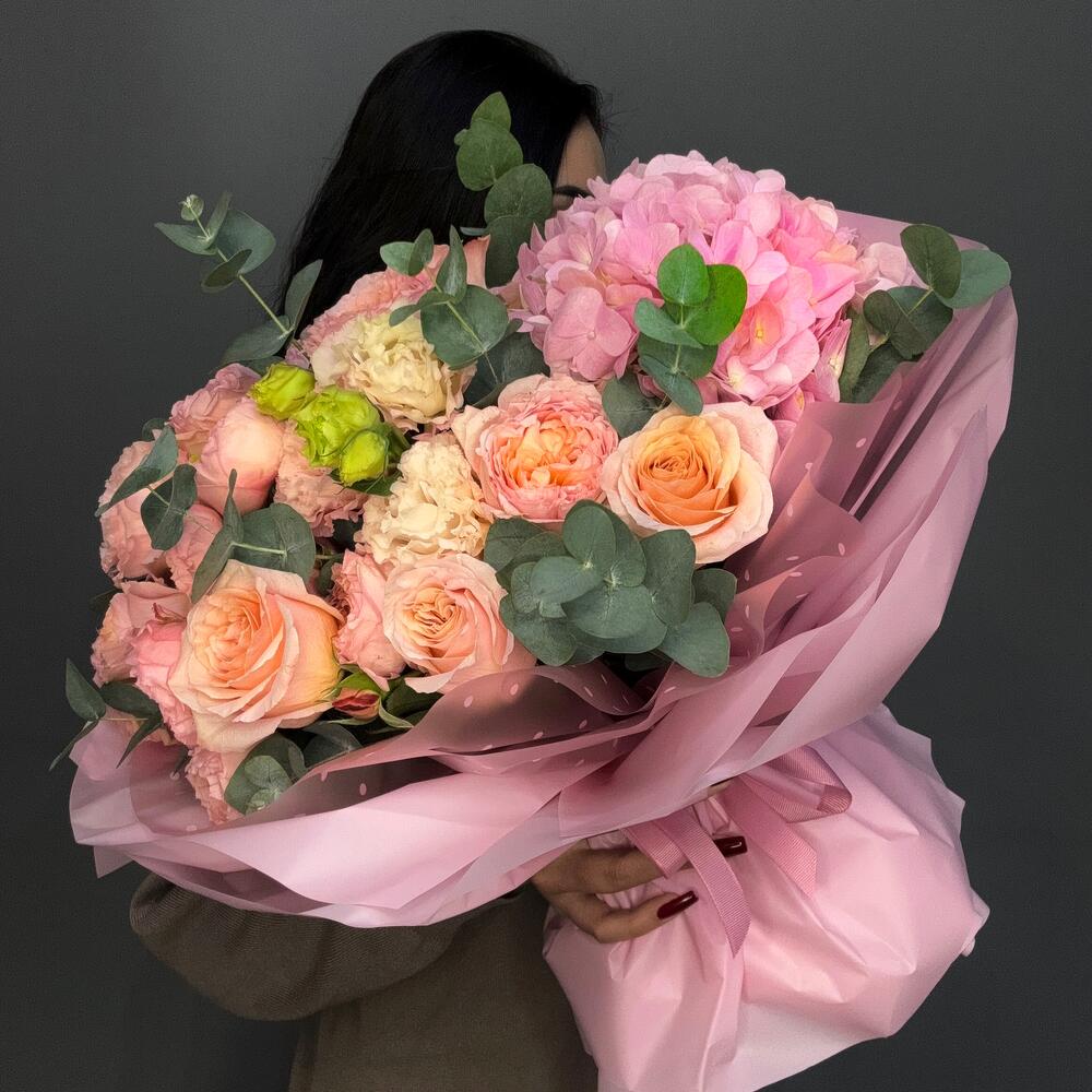 Гортензия - 1 шт. Лизиантус - 2 шт. Роза пионовидная - 5 шт. джульетта роза пионовидная - 5 шт.