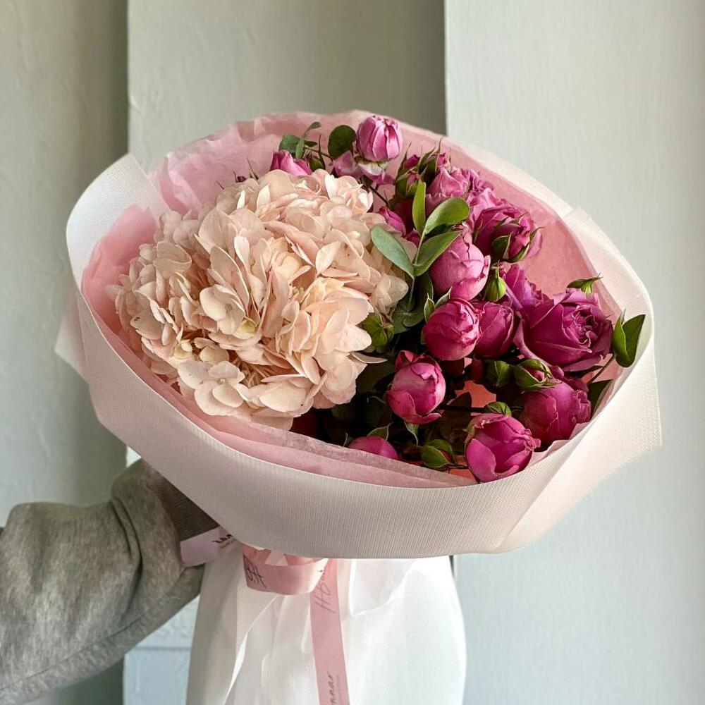 Гортензия - 1 шт. Кустовая роза - 5 шт. Зелень - 2 шт.