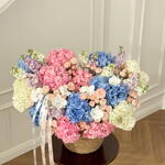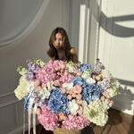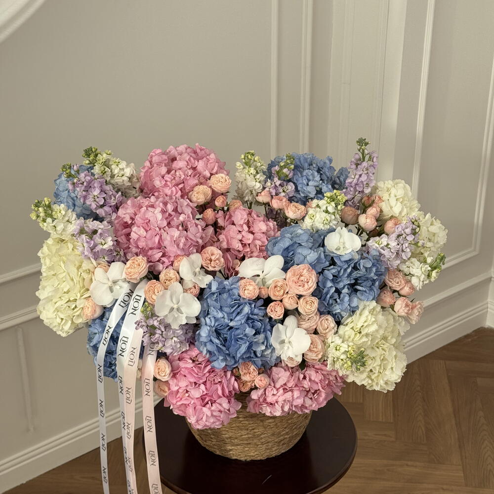 Маттиола - 13 шт. Кустовая роза - 12 шт. орхидея - 5 шт. гортензии - 13 шт.