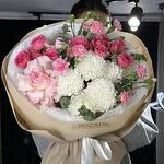 Хризантема кустовая - 1 шт. Роза - 1 шт. Гвоздика кустовая - 2 шт. Оформление - 1 шт. Эвкалипт Baby Blue - 5 шт. Спрей роза - 2 шт.