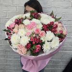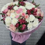 Альстромерия - 7 шт. Хризантема кустовая - 6 шт. Лента атласная - 1 шт. Тишью - 3 шт. Гвоздика кустовая - 3 шт. Спрей роза - 7 шт. аквабумага - 4 шт.
