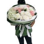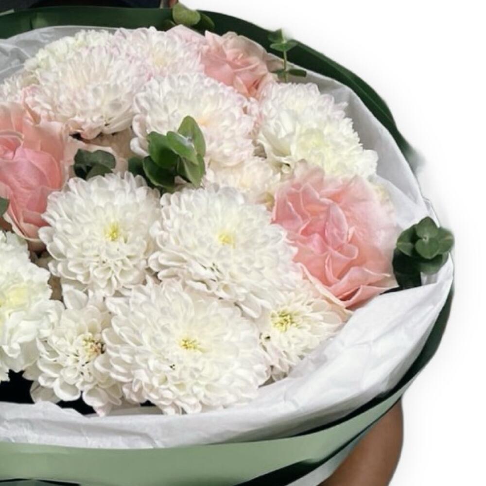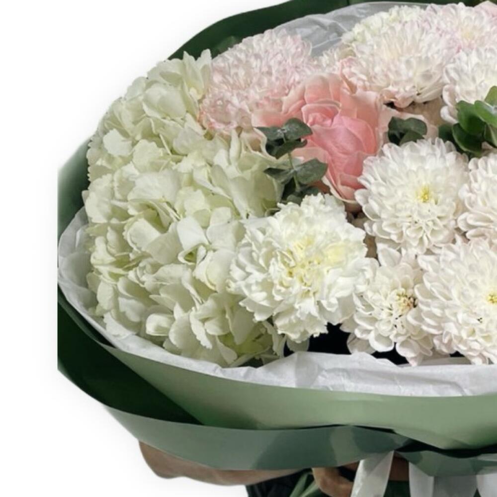 Эвкалипт - 5 шт. гвоздика в ассортименте - 3 шт. аква бумага - 4 шт. розы цветные эквадор - 3 шт. гортензия цвет в ассортименте - 1 шт. алтай хризантема кустовая - 3 шт.