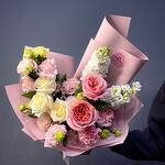 Лизиантус - 5 шт. Маттиола - 2 шт. Гвоздика - 3 шт. Пионовидная роза - 5 шт.