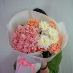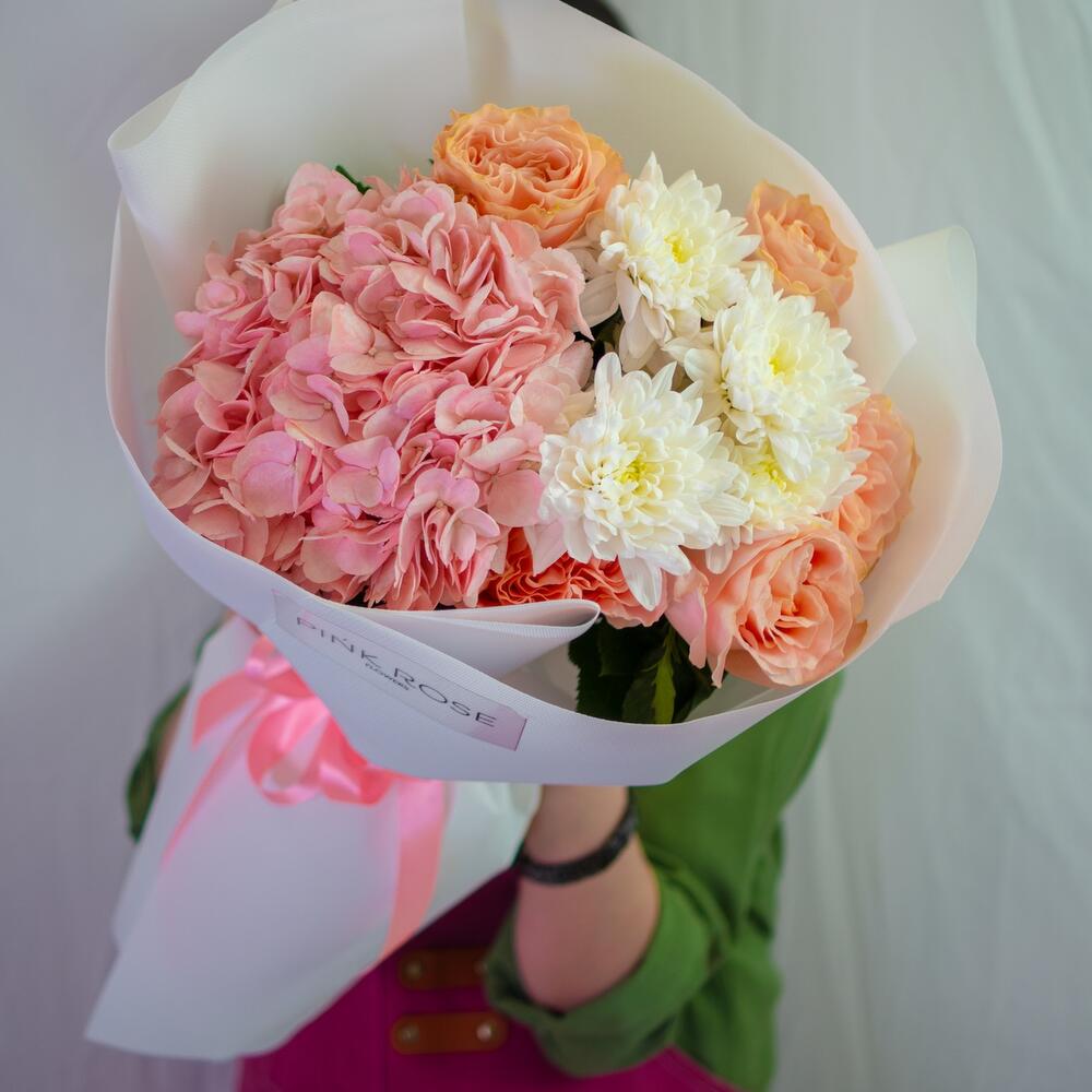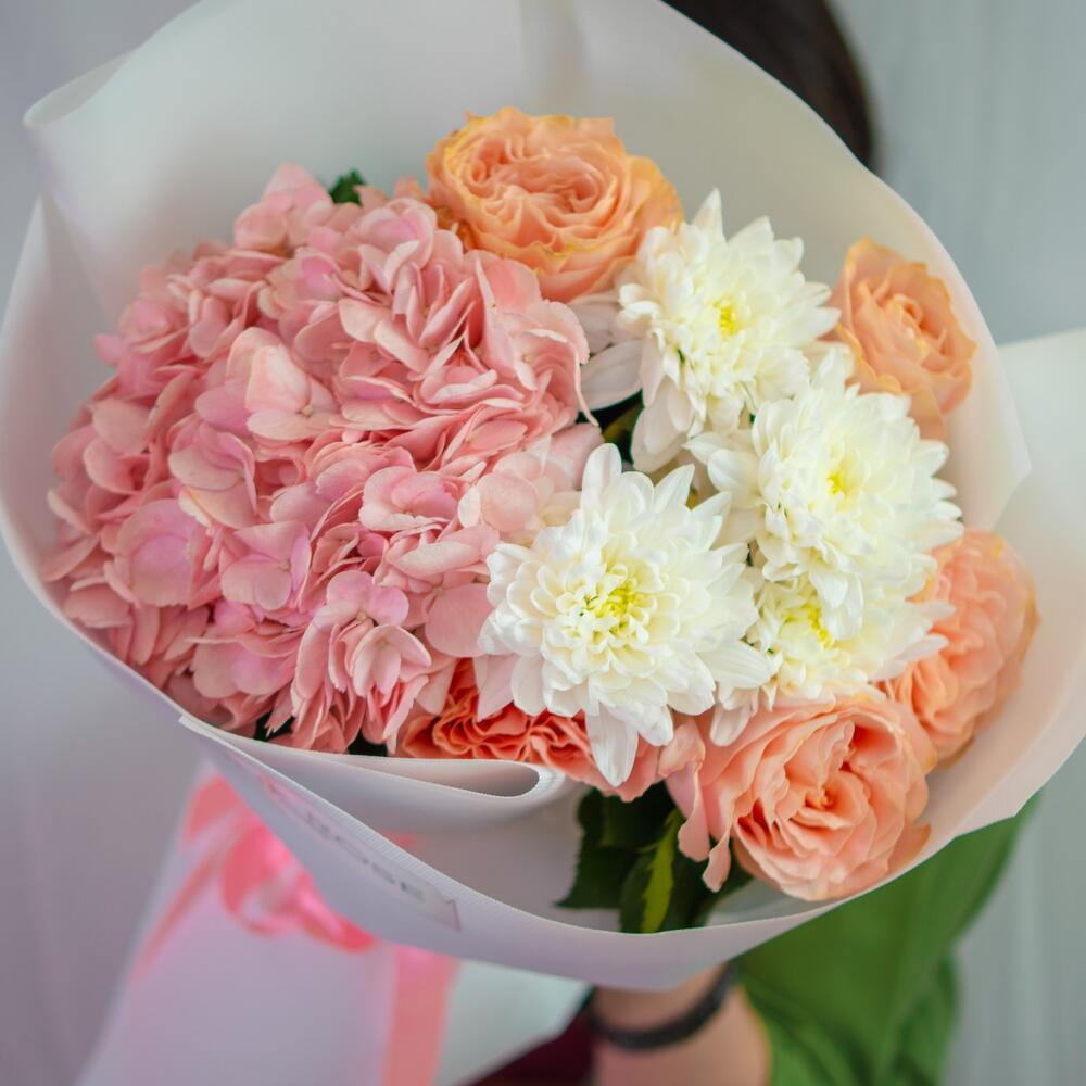 Гортензия - 1 шт. Хризантема кустовая - 1 шт. премиум роза - 5 шт.