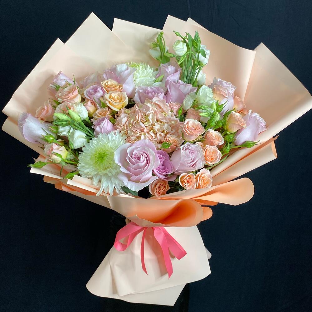 Лизиантус - 3 шт. Роза - 13 шт. Спрей роза - 3 шт. хризантемы одноголовые - 3 шт.