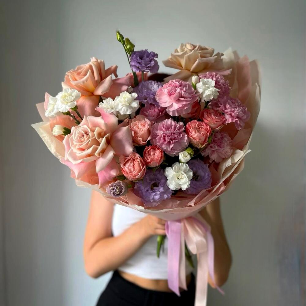 Лизиантус - 4 шт. Роза Эквадор - 3 шт. Диантус - 8 шт. Спрей роза - 2 шт.