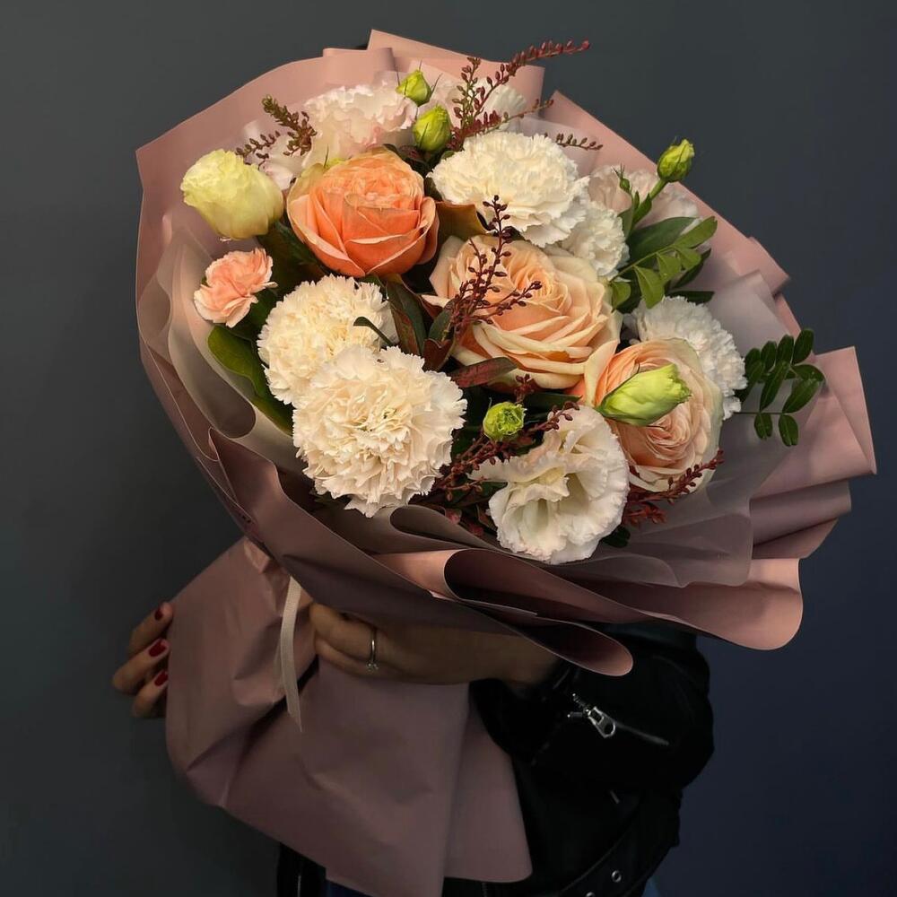 Лизиантус - 3 шт. Гвоздика - 5 шт. Роза пионовидная - 3 шт.