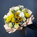 Мимоза - 2 шт. Гвоздика - 3 шт. Подсолнух - 3 шт. Роза пионовидная - 4 шт. Лизиантус Алиса Белый - 2 шт.