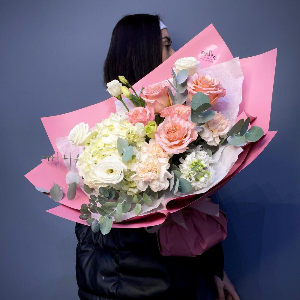 Гортензия - 1 шт. Маттиола - 1 шт. Гвоздика - 3 шт. Роза пионовидная - 5 шт. Лизиантус Алиса Белый - 3 шт.