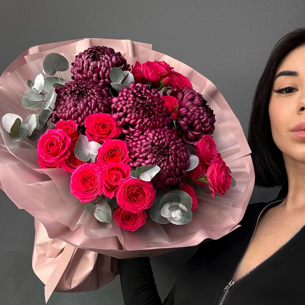 Эвкалипт - 1 шт. Спрей роза - 5 шт. хризантема бигуди - 5 шт.