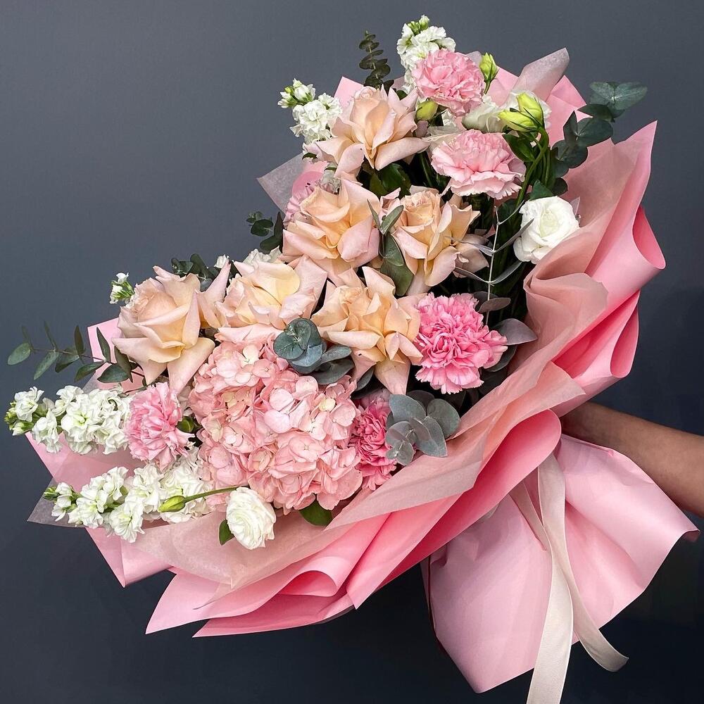 Гортензия - 1 шт. Лизиантус - 5 шт. Маттиола - 5 шт. Роза - 7 шт. Гвоздика - 7 шт.