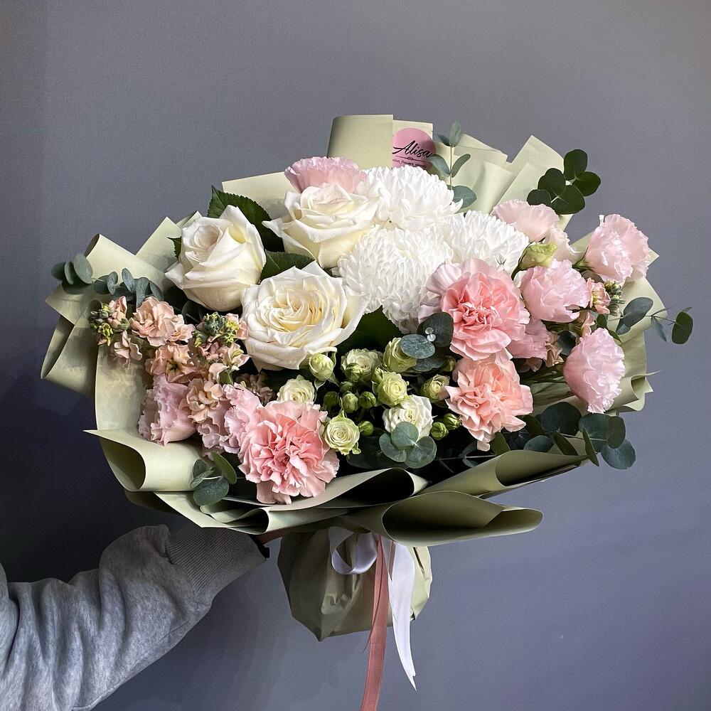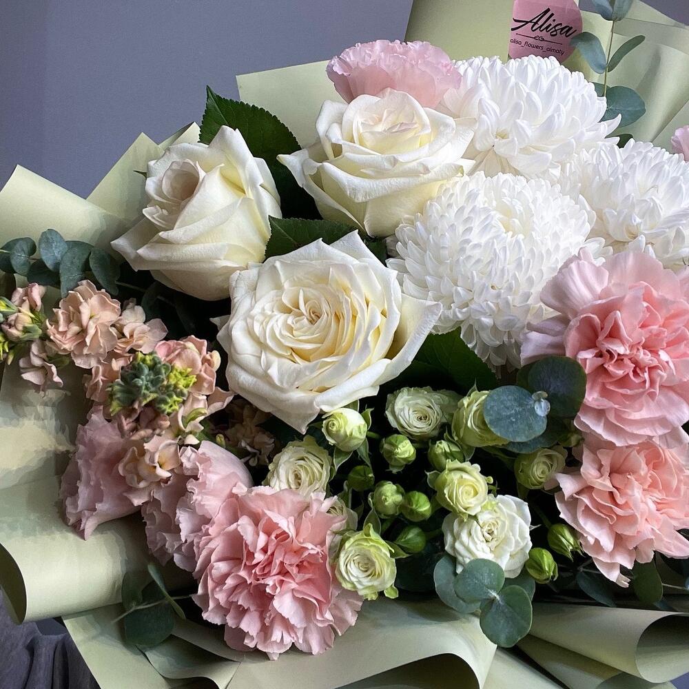 Лизиантус - 5 шт. Маттиола - 3 шт. Хризантема - 3 шт. Диантус - 3 шт. Роза пионовидная - 3 шт. Спрей роза - 2 шт.