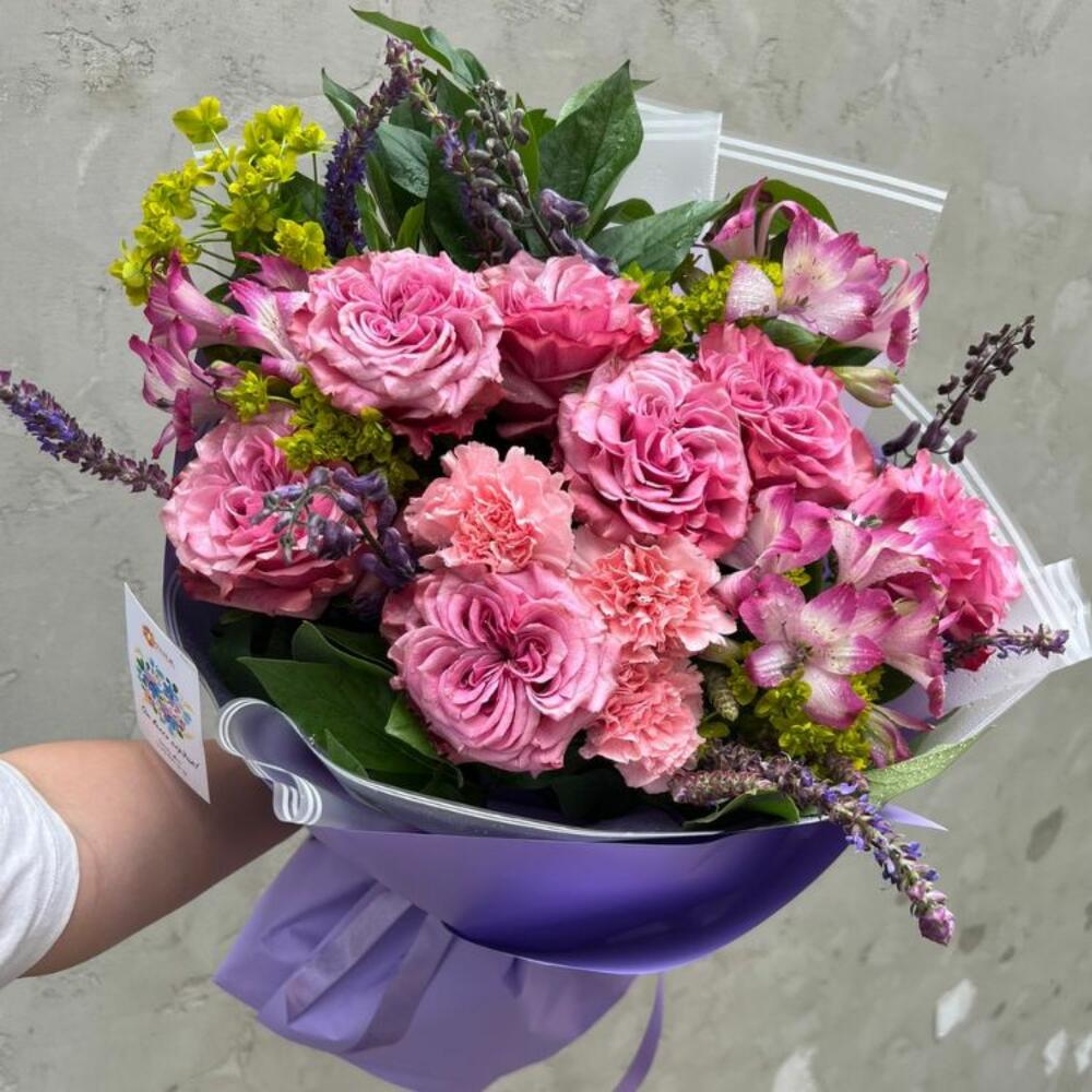 Альстромерия - 3 шт. Молочай - 4 шт. голландские розы - 7 шт. зелень пионов - 2 шт.
