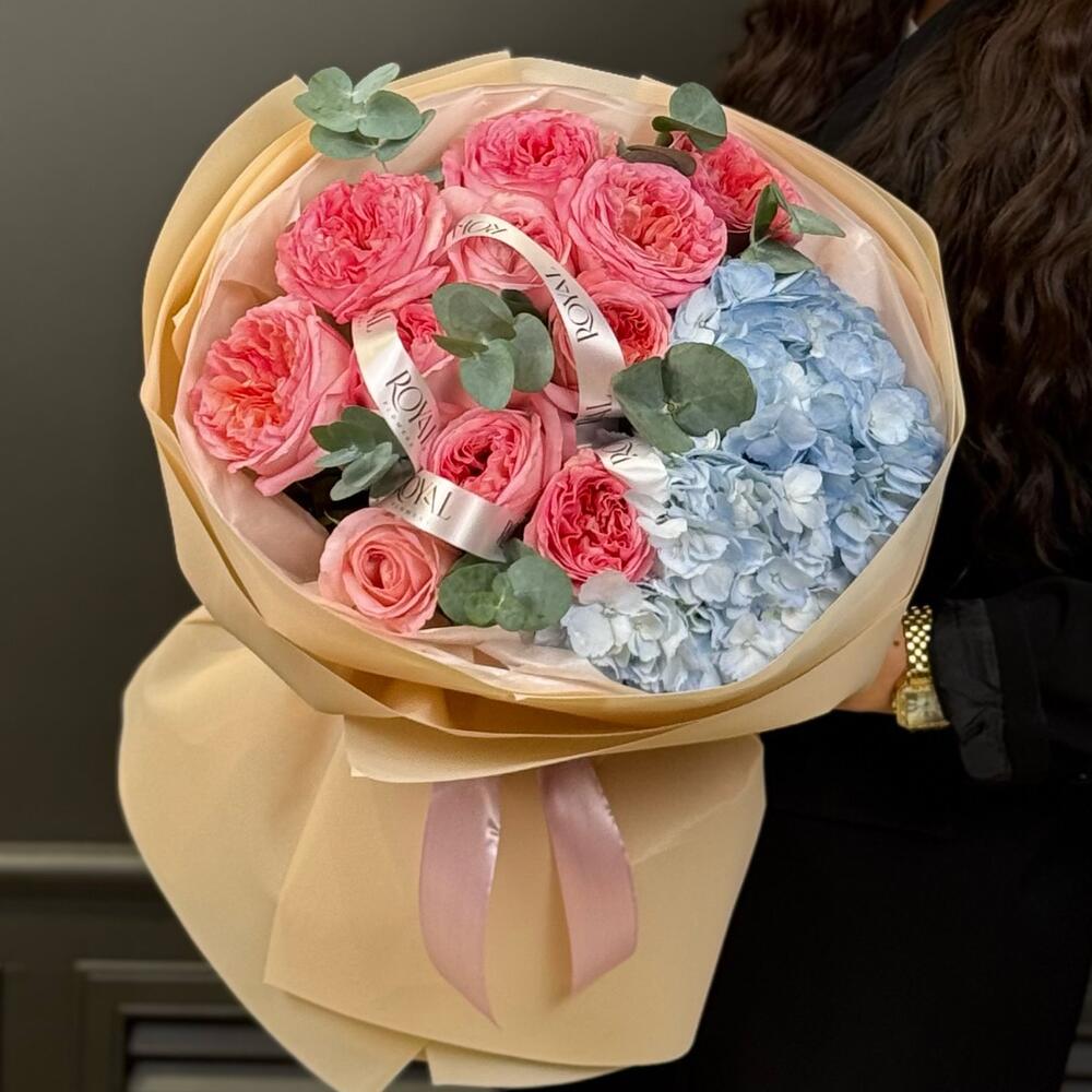 Гортензия - 1 шт. Эвкалипт - 2 шт. Роза пионовидная - 11 шт. Оформление - 1 шт.
