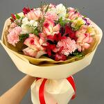 Создайте особое настроение с изысканным букетом из гвоздик, альстромерий, роз и сентябрины. Яркие и нежные цвета этого композиционного шедевра подойдут для любого случая, будь то поздравление, знак внимания или просто желание порадовать близкого человека. Состав букета: Гвоздика (7 шт) — символ вечной любви, добавляет яркости и оригинальности. Альстромерия (6 шт) — нежные цветы, олицетворяющие дружбу и преданность. Роза (5 шт) — классика жанра, которая всегда вызывает восхищение. Сентябрина (4 шт) — добавляет текстуру и объем, завершая композицию.