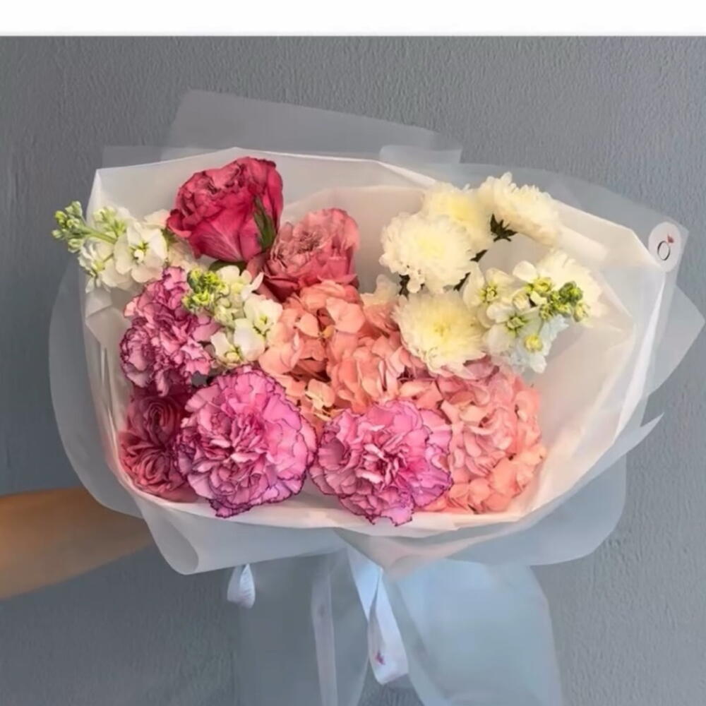 Маттиола - 3 шт. Хризантема кустовая - 1 шт. Роза - 3 шт. Гвоздика - 3 шт. Гортензия розовая - 1 шт.