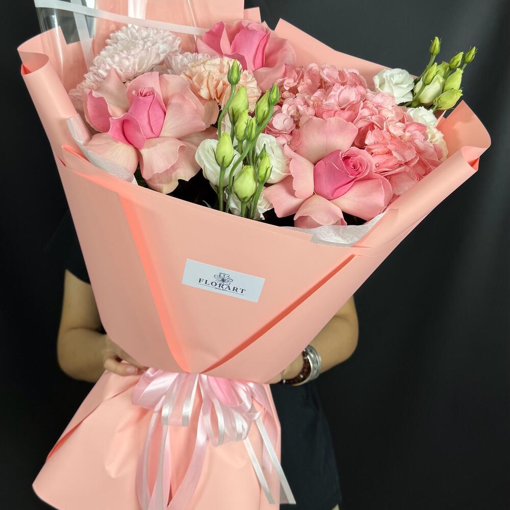 Гортензия - 1 шт. Лизиантус - 2 шт. Хризантема кустовая - 1 шт. Роза - 3 шт. Гвоздика - 1 шт.